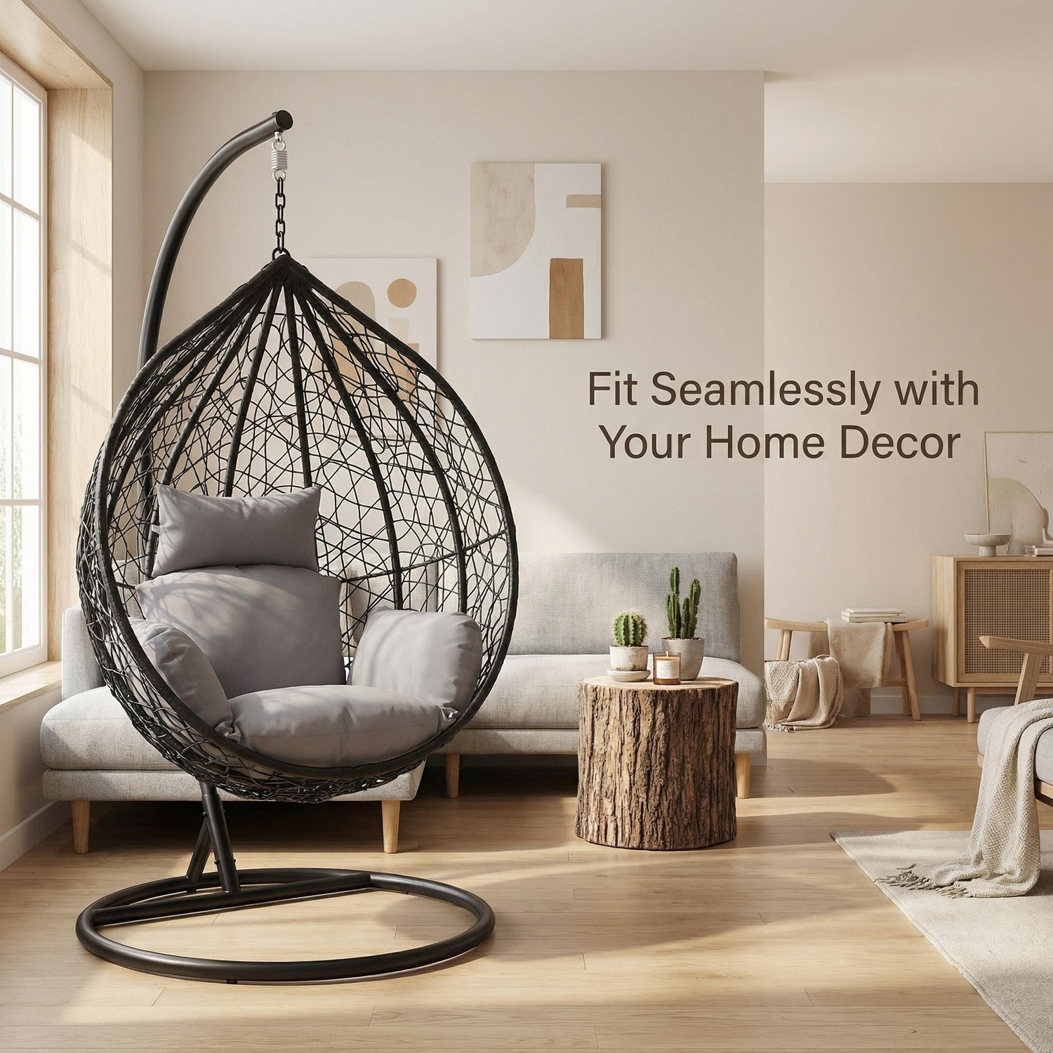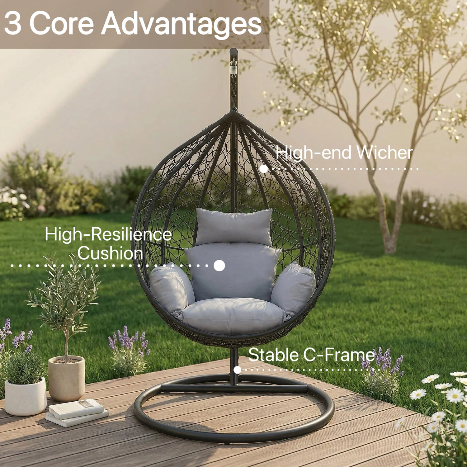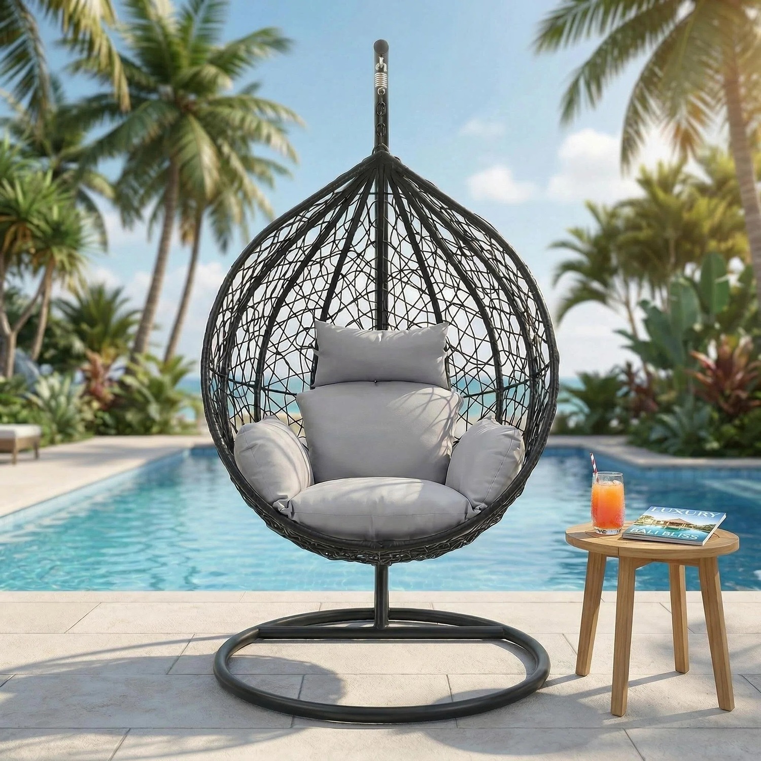 Escape to your outdoor space with this rattan swing chair, designed for comfort and relaxation. It is hand-woven using high-quality, weatherproof polyrattan, making it perfect for balconies, patios, or garden areas. The chair comes with deep-filled, waterproof cushions that provide a soft and supportive seating experience, suitable for both indoor and outdoor use, and features a strong, sturdy steel frame for long-lasting durability. The spring-hanging design ensures a smooth and comfortable swing motion, and the frame is fully painted and treated to resist rust, making it ideal for all weather conditions and very easy to assemble. This stylish and practical chair is a perfect addition to any home space for relaxing and unwinding in comfort.