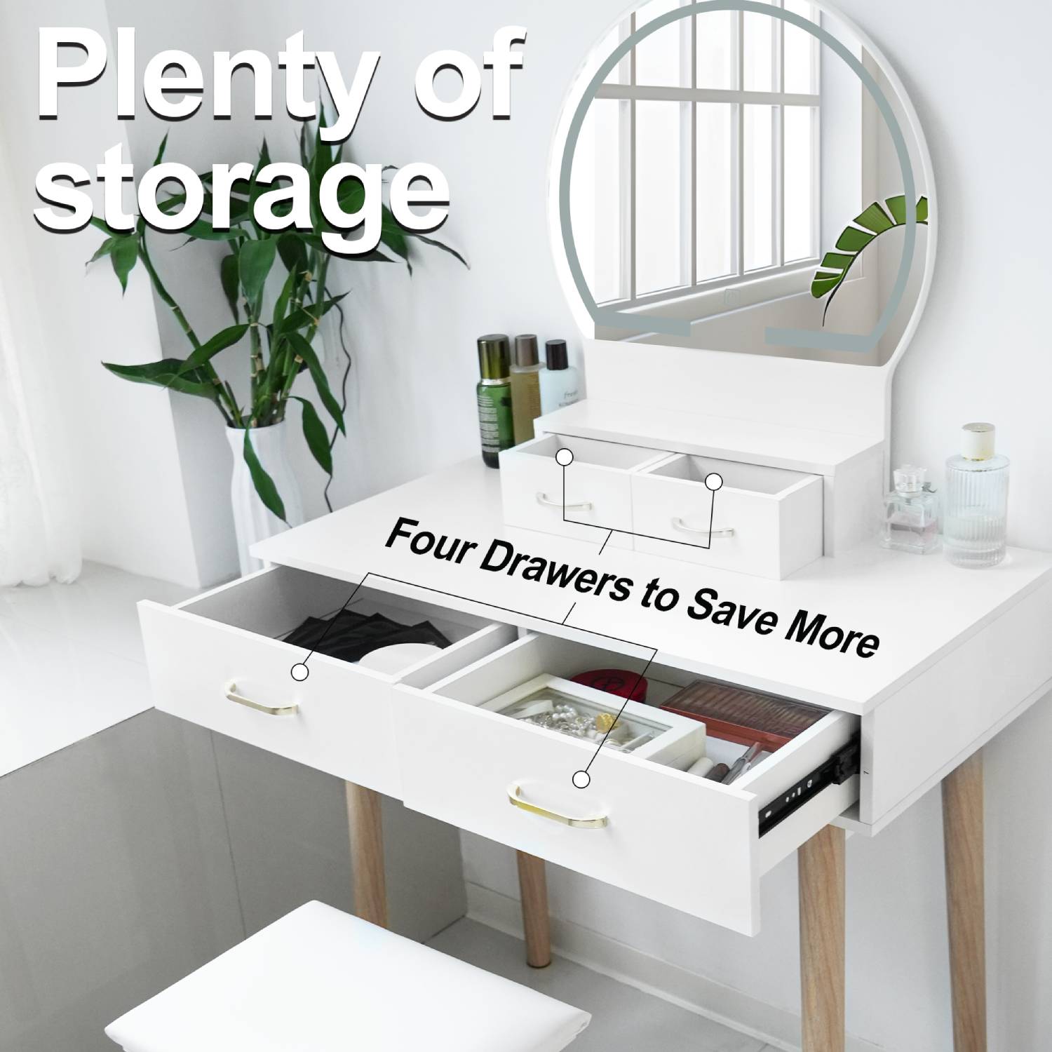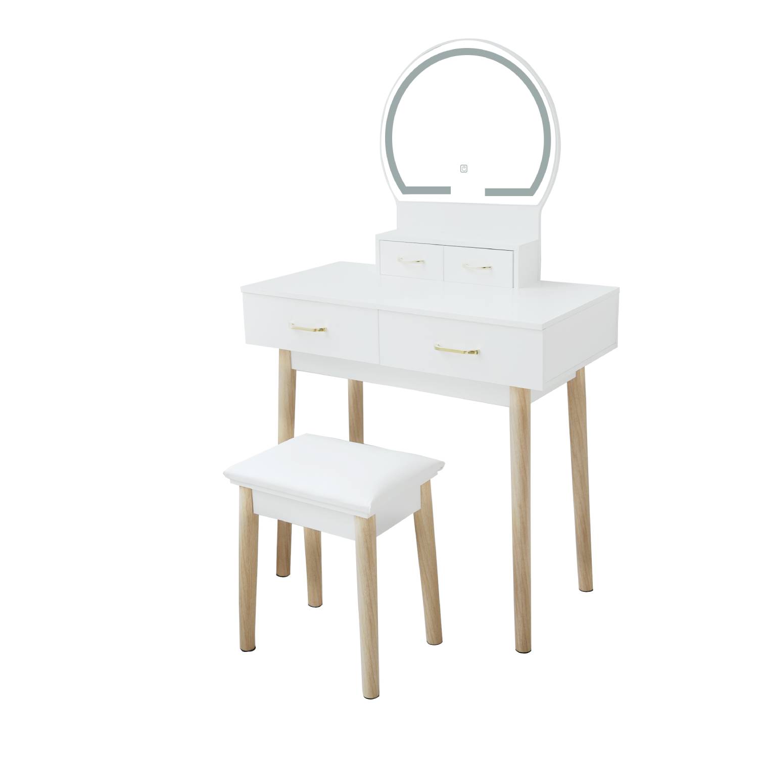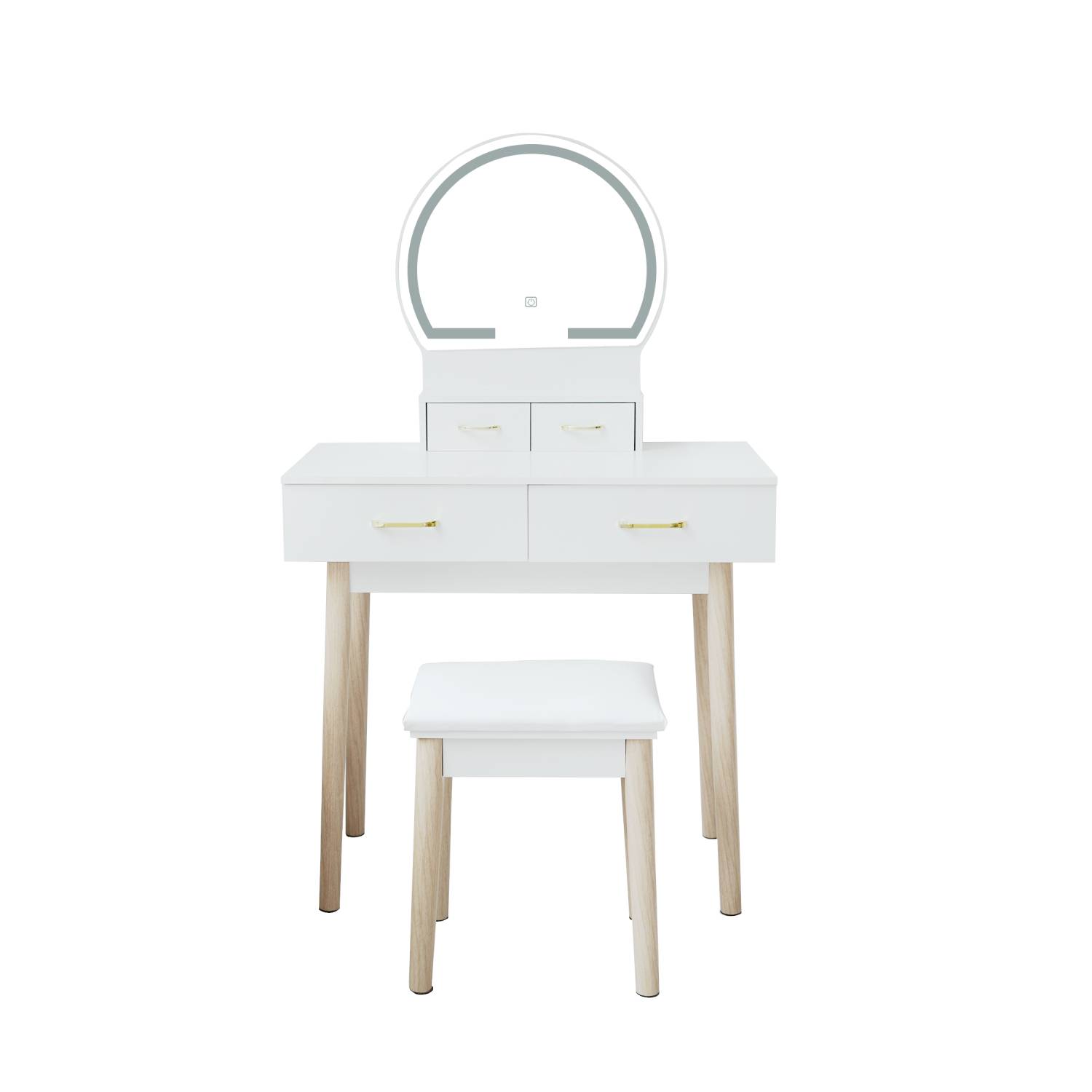 Transform your bedroom into a glamorous beauty haven with our Hollywood Dressing Table Set. This elegant and modern makeup table, measuring 81 x 41 x 133 cm, features a sleek white finish that effortlessly complements any decor. The centerpiece is a stunning round mirror adorned with LED lights, providing perfect illumination for flawless makeup application. With four spacious drawers, you'll have ample storage for all your beauty essentials, while the included cushioned stool ensures comfort as you get ready. Elevate your daily routine with this stylish and functional dressing kit, designed to bring a touch of Hollywood elegance to your home.