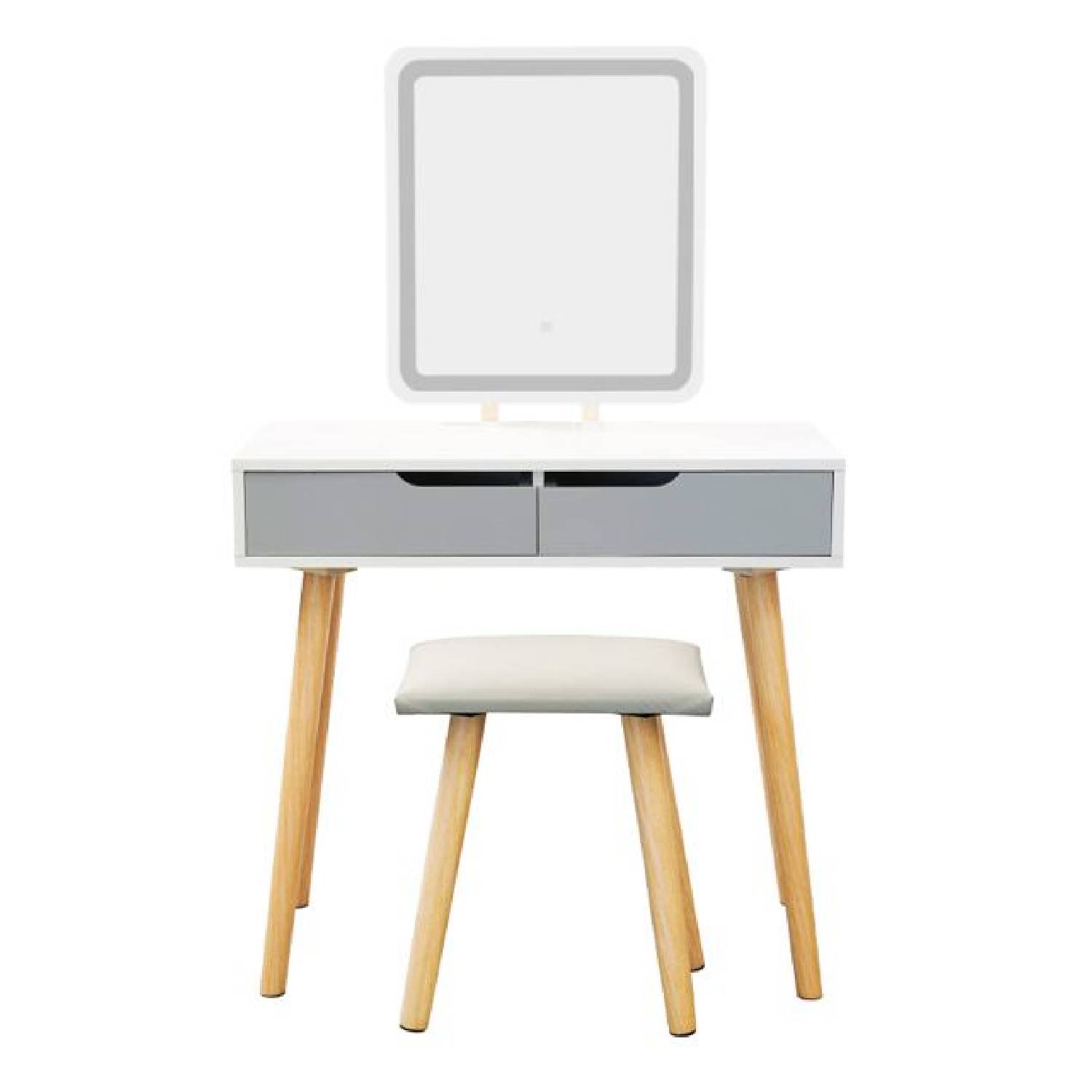 The Alivio Vanity Dressing Table Set with LED Adjustable Light Mirror & Stool combines elegance, functionality, and convenience to elevate your bedroom or dressing area. Designed in a glamorous Hollywood style, this set features a high-definition rectangular mirror with built-in energy-efficient LED lights and three adjustable color modes—warm, natural, and cool white—to suit any makeup or lighting need. The touch-screen mirror allows easy brightness adjustment, while two sliding drawers with DIY dividers and a large-capacity tabletop provide ample storage for cosmetics, jewelry, and accessories. Crafted with solid wood legs, anti-scratch pads, and a thick soft sponge stool, it ensures durability, stability, and comfort. Easy to clean, non-slip, and built for heavy-duty use, this stylish vanity set offers a luxurious and practical solution for everyday grooming and makeup application.