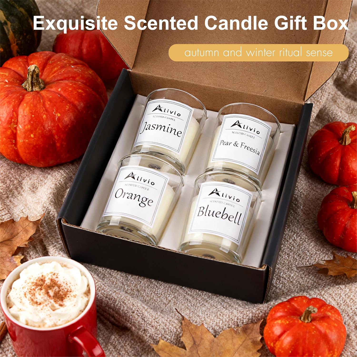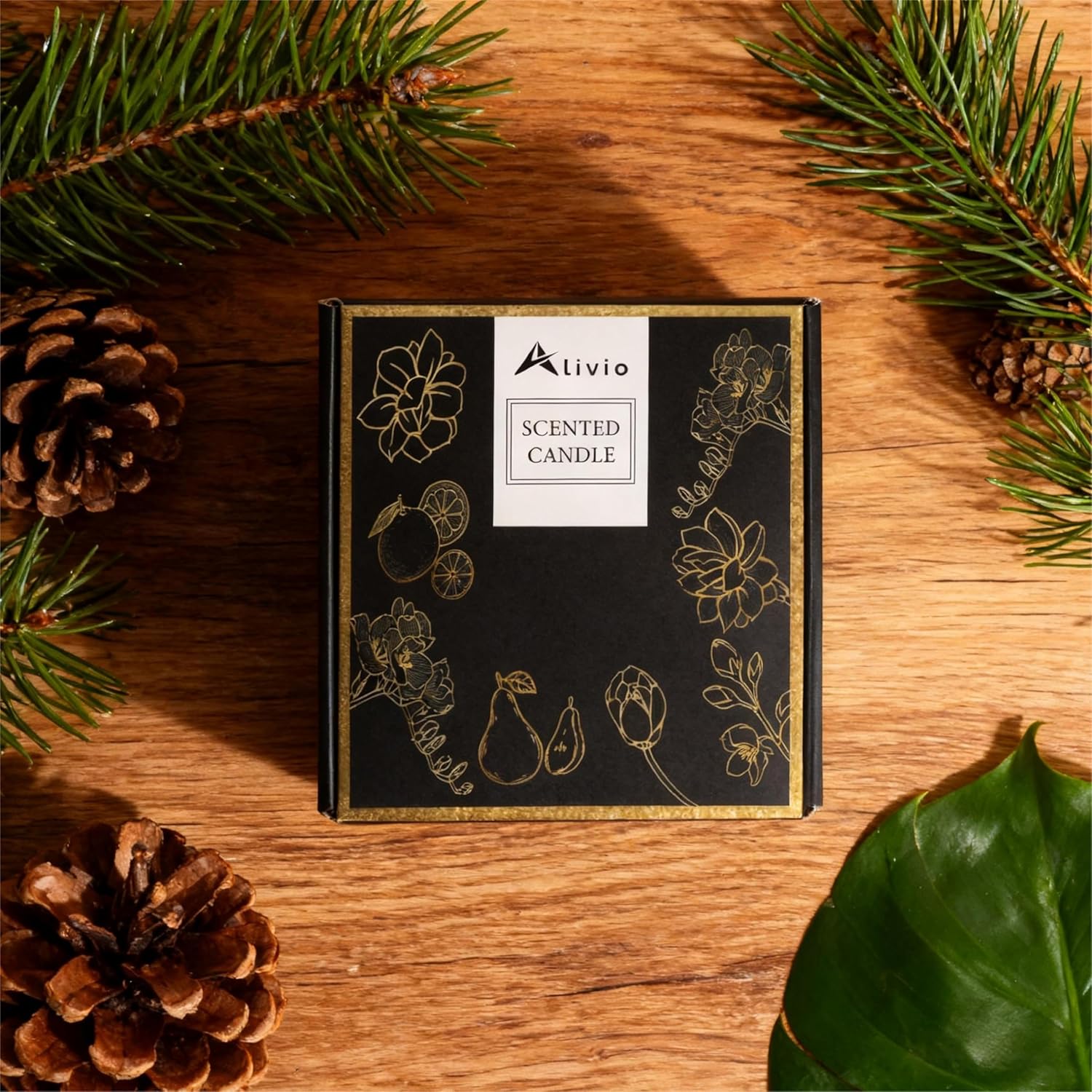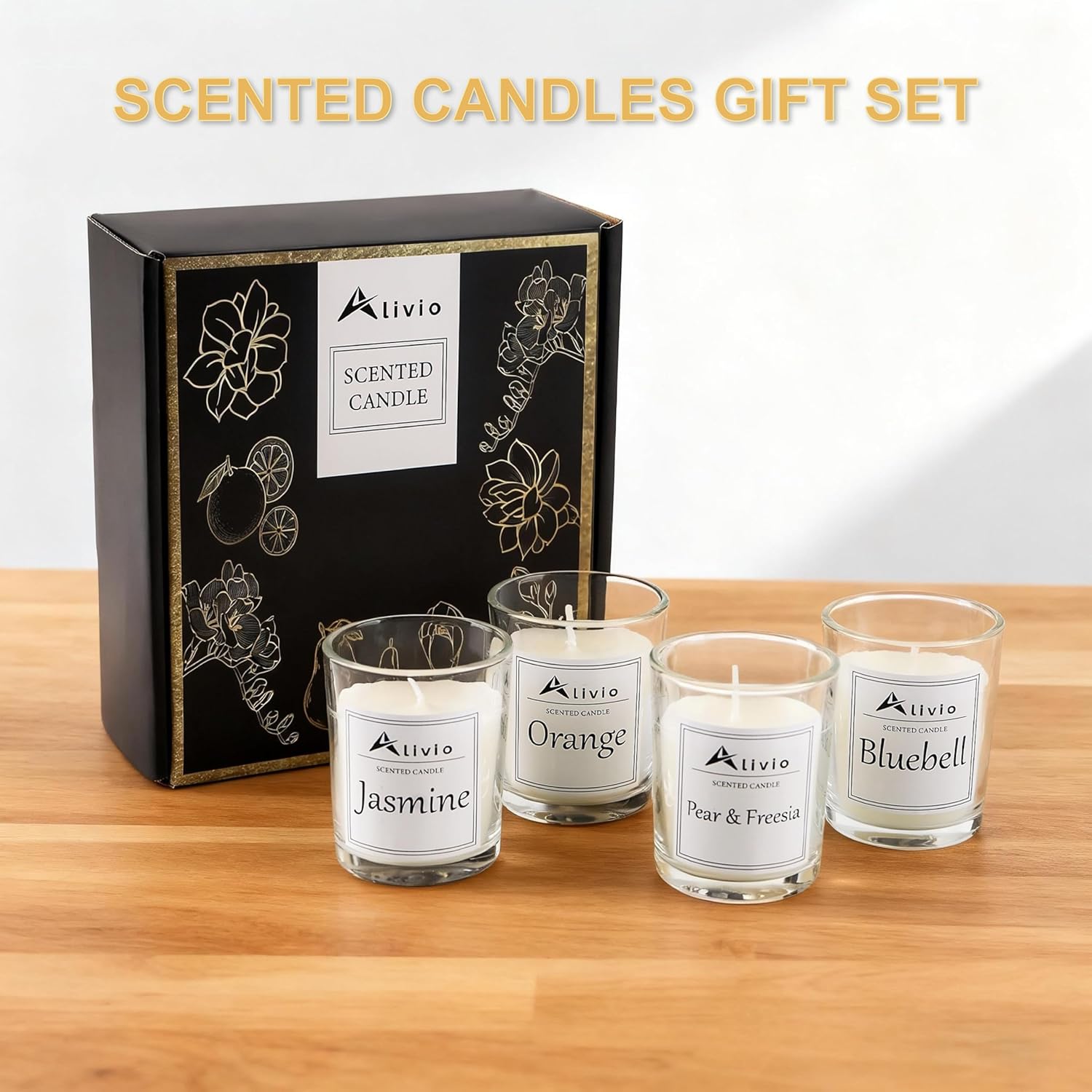 Create a soothing and luxurious atmosphere with the Alivio 4-Piece Scented Candles Gift Set, crafted from 100% natural soy wax for a clean and long-lasting burn. This exquisite aromatherapy candle set includes four delightful fragrances — Jasmine, Orange, Pear & Freesia, and Bluebell — designed to calm your mood, relieve stress, and relax your body. Perfect for creating a warm, cozy ambiance during autumn and winter, these candles are housed in elegant glass jars and come beautifully packaged in a premium black and gold gift box, making them ideal for gifting or personal use. Measuring 16 x 6 x 17 cm, this compact yet elegant set brings a sense of ritual and relaxation to your home, spa, or meditation space. Perfect for birthdays, holidays, or self-care moments, the Alivio Scented Candle Gift Set is your go-to choice for comfort, serenity, and timeless fragrance.
