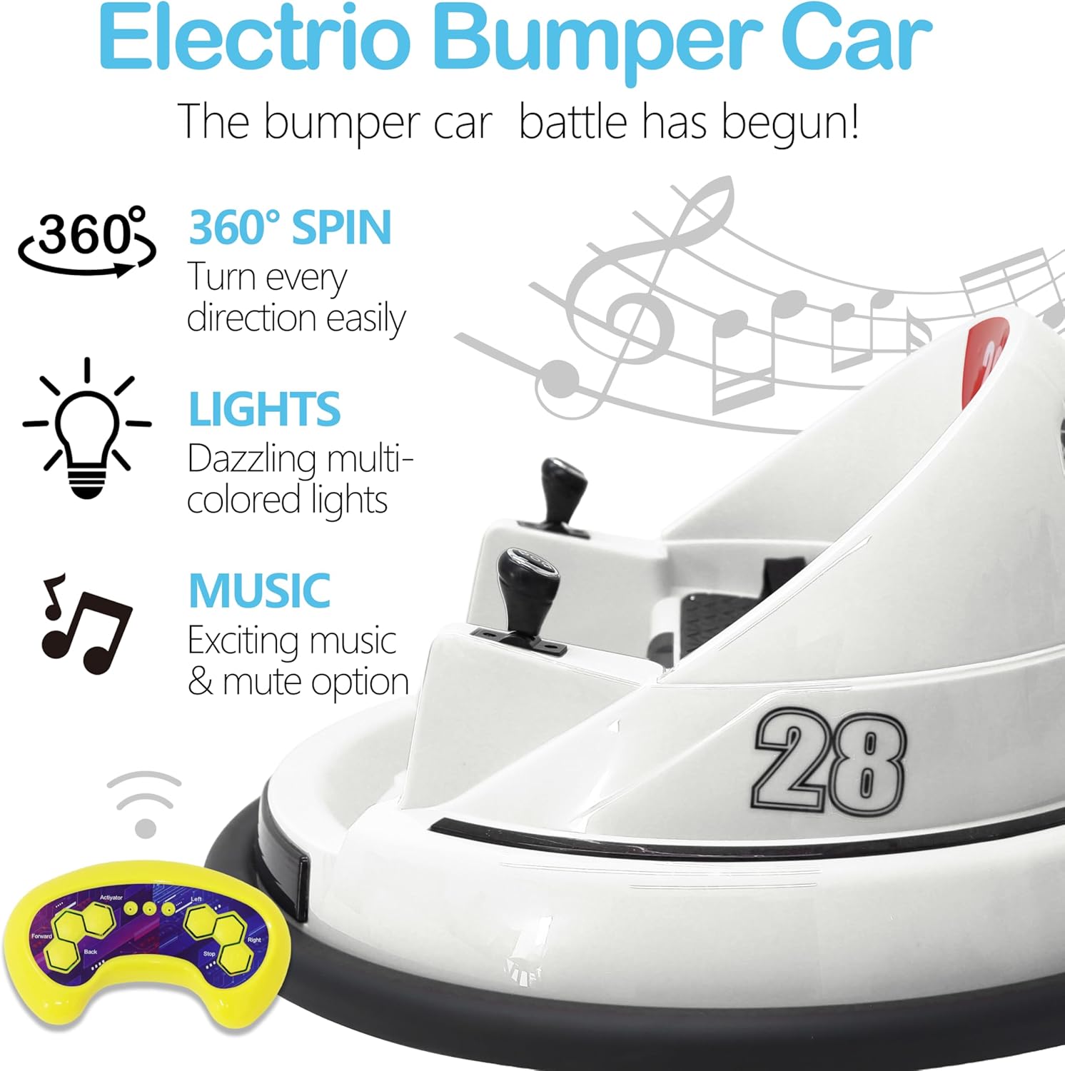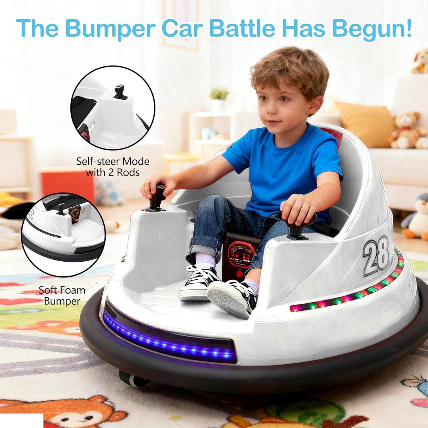 <!-- x-tinymce/html -->Turn your child’s playtime into a fun-filled adventure with the Alivio Remote Control Bumper Car, A perfect blend of excitement, safety, and innovation! Designed for young riders, this bumper car offers a 360° spin experience, bright LED lights, and cheerful music for endless entertainment. With both manual control and a 2.4GHz Bluetooth remote, parents can take charge anytime to ensure complete safety.