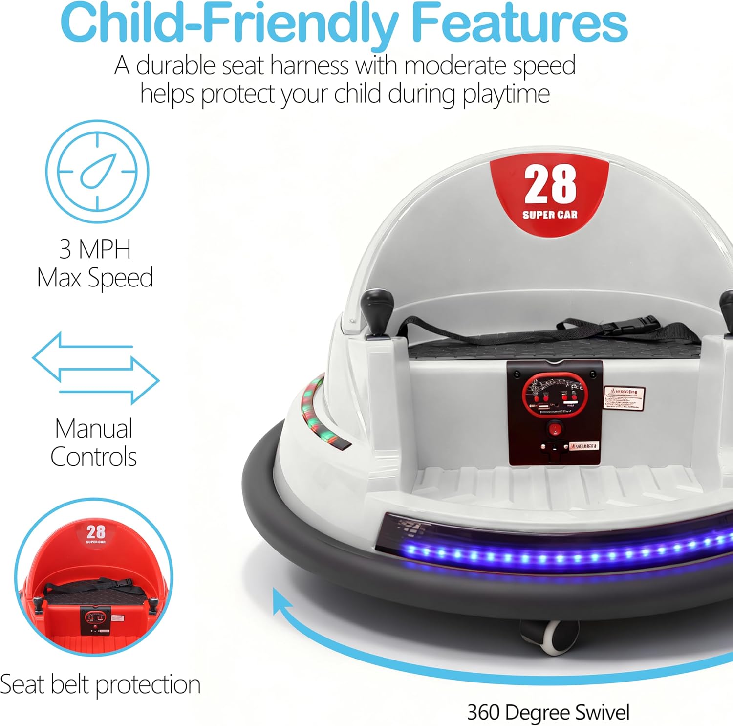 Crafted with a soft foam bumper and durable safety harness, this car keeps your child secure while bumping, spinning, and laughing their way through playtime. The child-friendly speed limit (3 MPH) ensures a safe yet thrilling ride, while the comfortable seat with belt protection keeps your little one steady during motion. Compact, stylish, and fun the Alivio bumper car is perfect for indoor and outdoor play, offering the ultimate ride-on experience for kids.