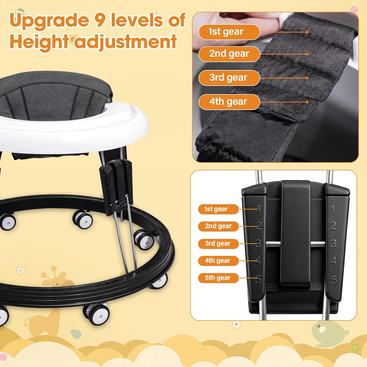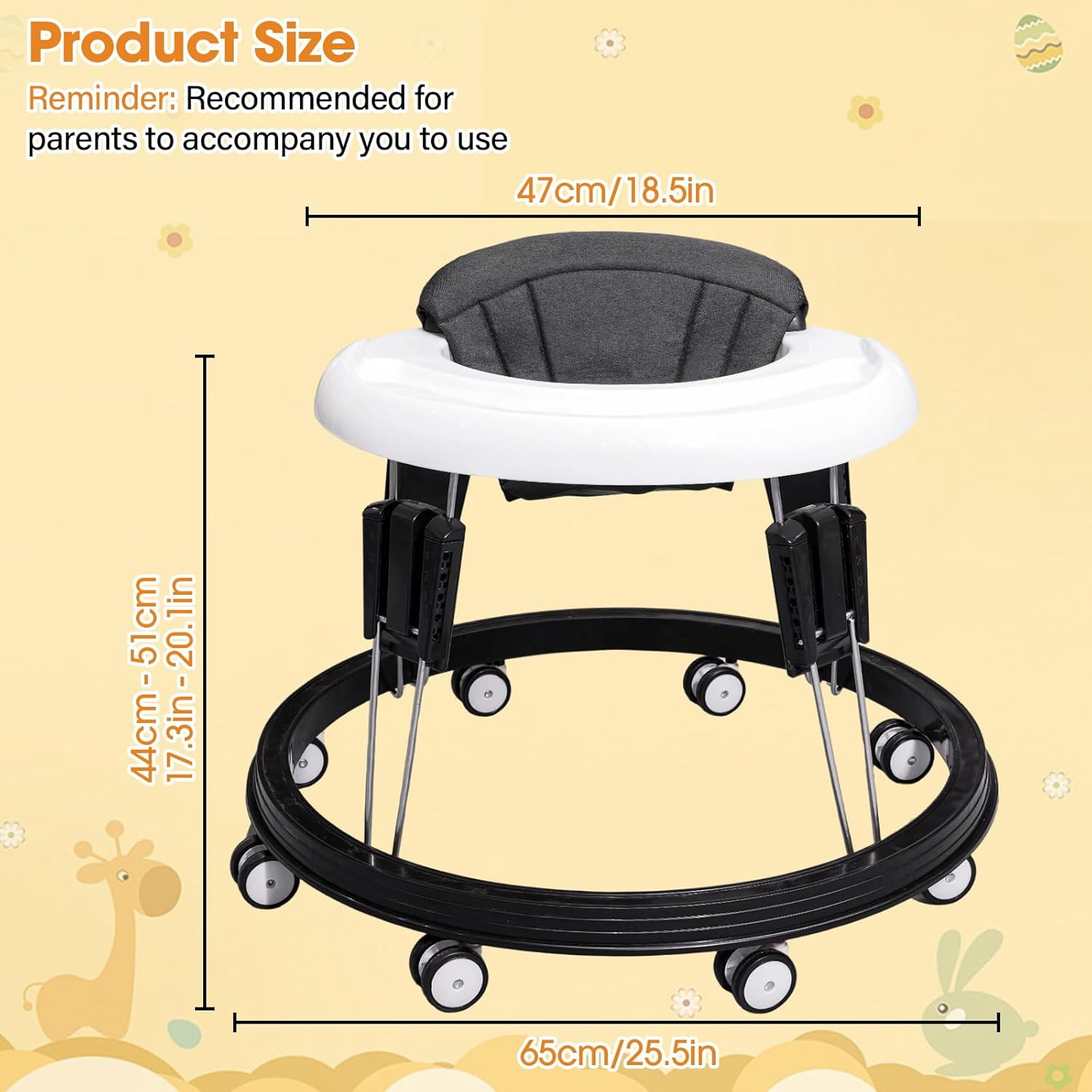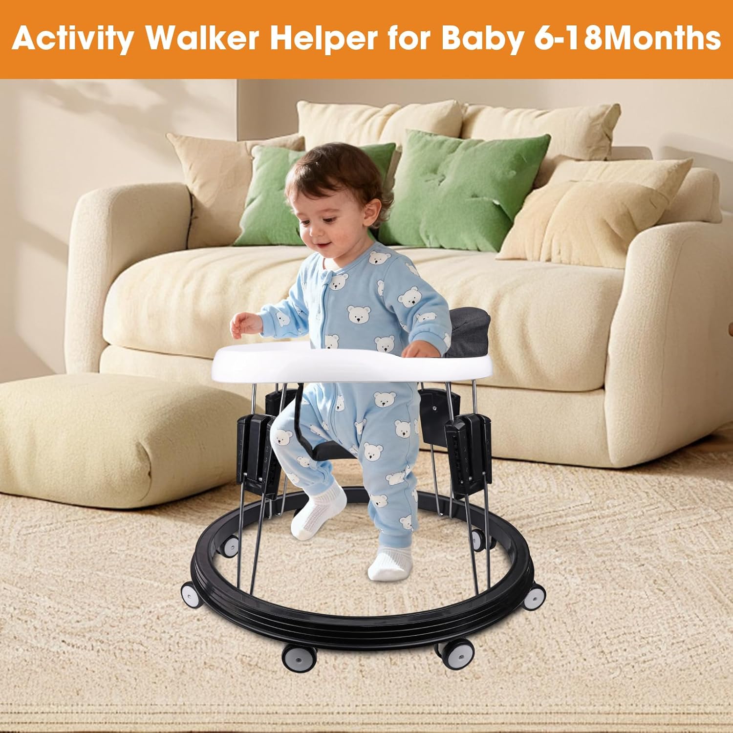 <!-- x-tinymce/html -->Give your little one the freedom to explore safely with this foldable baby activity walker designed to support your baby’s first steps with confidence and comfort. The sturdy cylinder structure ensures stable movement, while the widened triangular base prevents tipping or jamming, offering 360-degree protection. With nine adjustable height levels, it easily adapts to your child’s growth stages at the press of a button. When not in use, it folds quickly and compactly for convenient storage or travel. The minimalist plate design is stylish, durable, and easy to clean, providing a smooth surface for snacks or playtime. Made from high-quality eco-friendly materials, this walker offers a safe, stable, and enjoyable walking experience for babies aged 6 to 18 months.