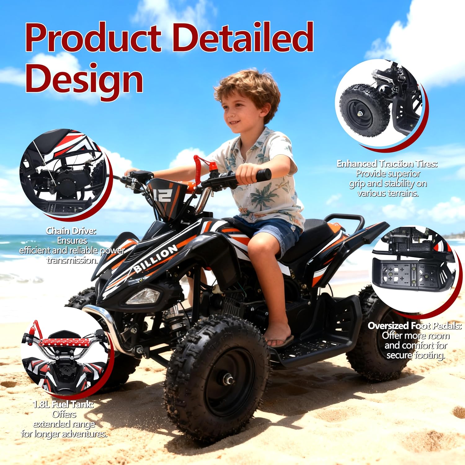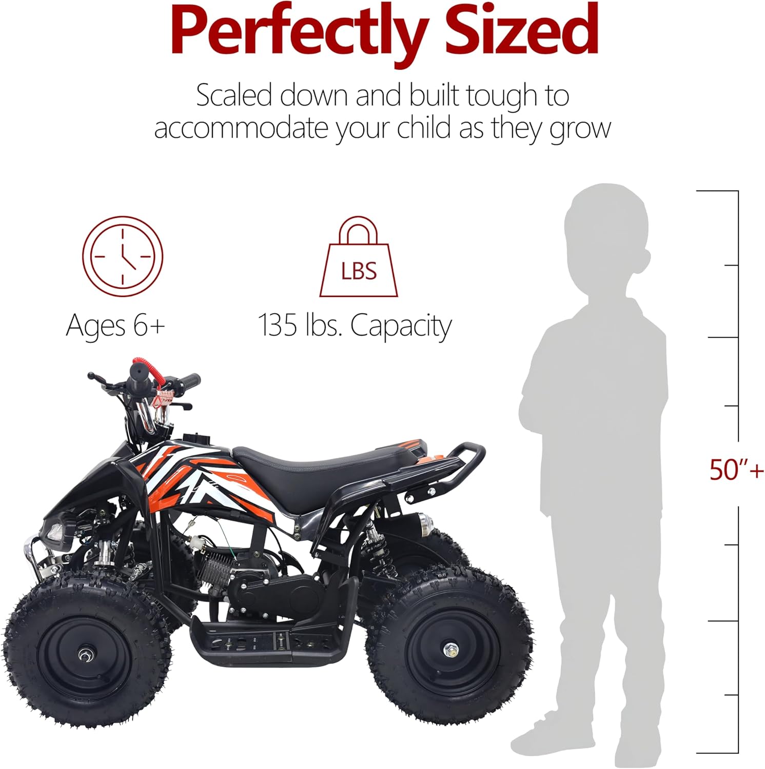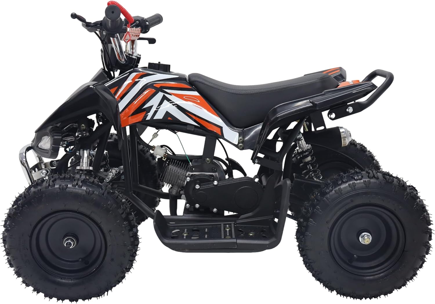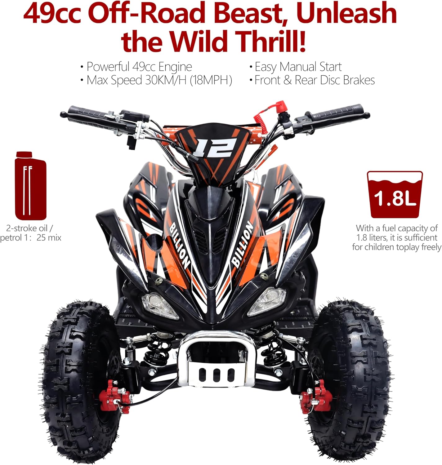 Unleash your child’s adventurous spirit with the 49CC Kids Mini ATV Quad Bike — a compact yet powerful off-road beast built for fun, durability, and safety. Designed for young riders aged 6 years and above, this ATV features a 49cc 2-stroke air-cooled engine with a manual start, offering real power and performance in a kid-sized frame. Its rugged steel construction, rubber handles, and high-grip 6-inch off-road tires ensure stability and control across all terrains. Perfectly scaled down to fit younger riders, this mini ATV offers a comfortable 52cm seat height, chain drive transmission, and front & rear disc brakes for responsive stopping power. The 1.8L fuel tank and CDI ignition system provide efficient performance and easy starts every time. With a top speed of up to 50 km/h and a max load capacity of 60 kg (135 lbs), this ATV guarantees endless excitement while ensuring safety and control.