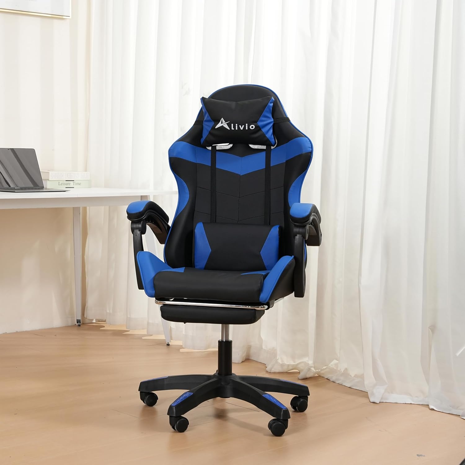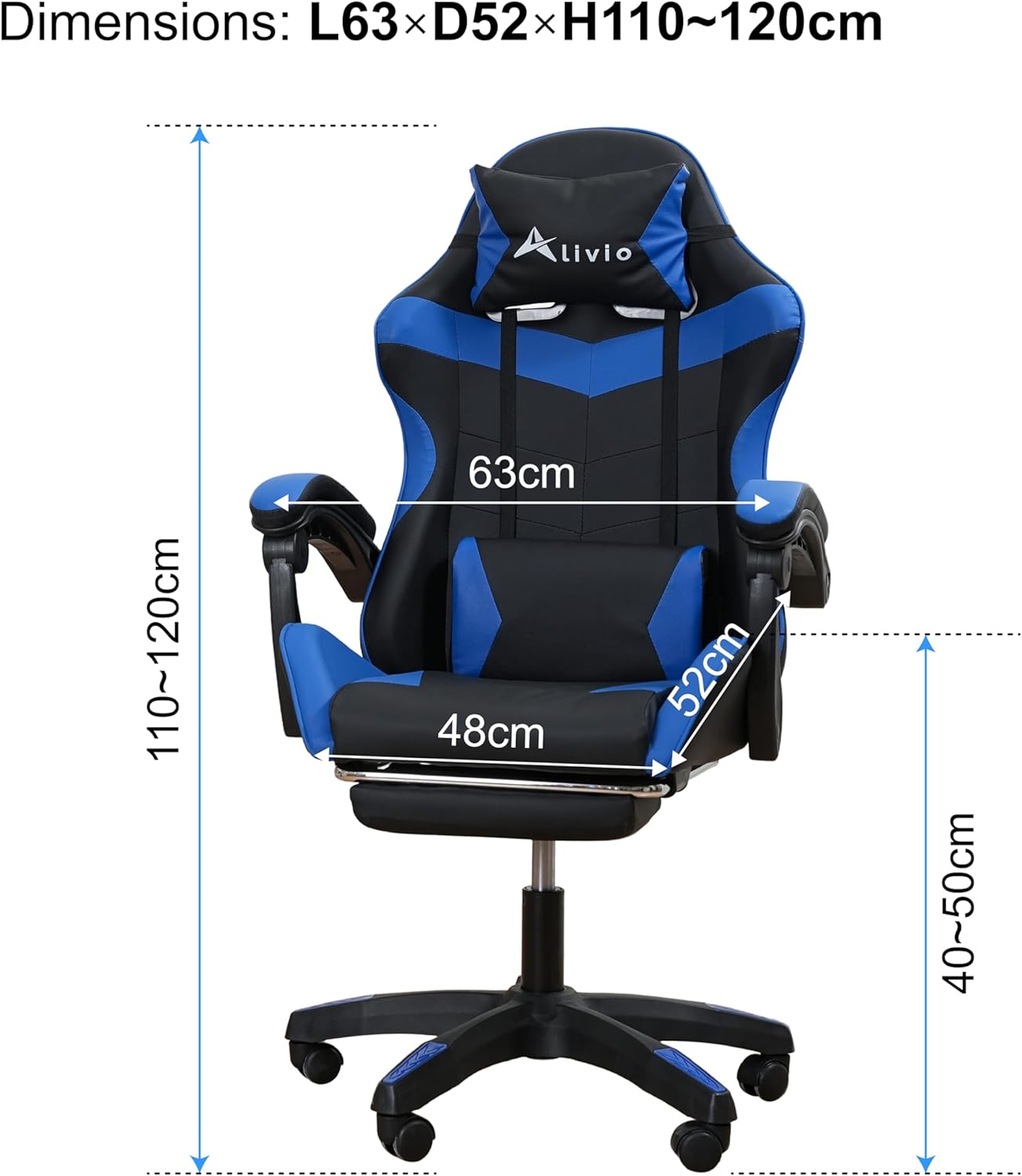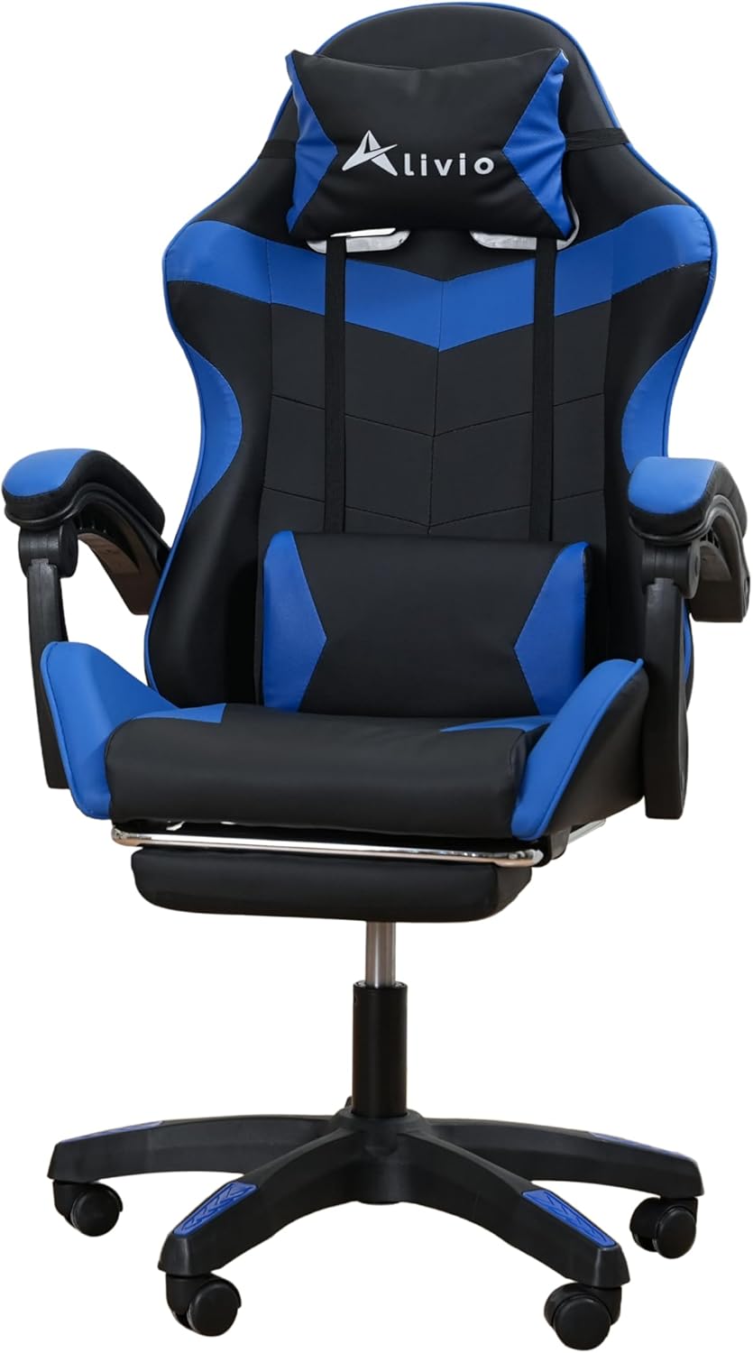 The Alivio professional gaming chair is built for serious gamers and smart-working executives who crave the adrenaline of a fully equipped gaming seat, featuring an all-metal frame, 160-degree full-tilt mechanism, retractable footrest, height-adjustable seat, and linked armrests, along with a complimentary neck pillow and USB-powered lumbar massage pillow for optimal comfort. Its thickened memory-foam padding on the seat and armrests, combined with supportive headrest and lumbar cushions, ensures exceptional comfort during long sessions. Crafted with high-density shaping foam for enhanced resilience, a sturdy 1.8mm steel frame for stability, and skin-friendly, wear-resistant PU leather, the Alivio Racing gaming chair is perfect for home, office, conference spaces, or gaming rooms and makes an ideal gift for any occasion.