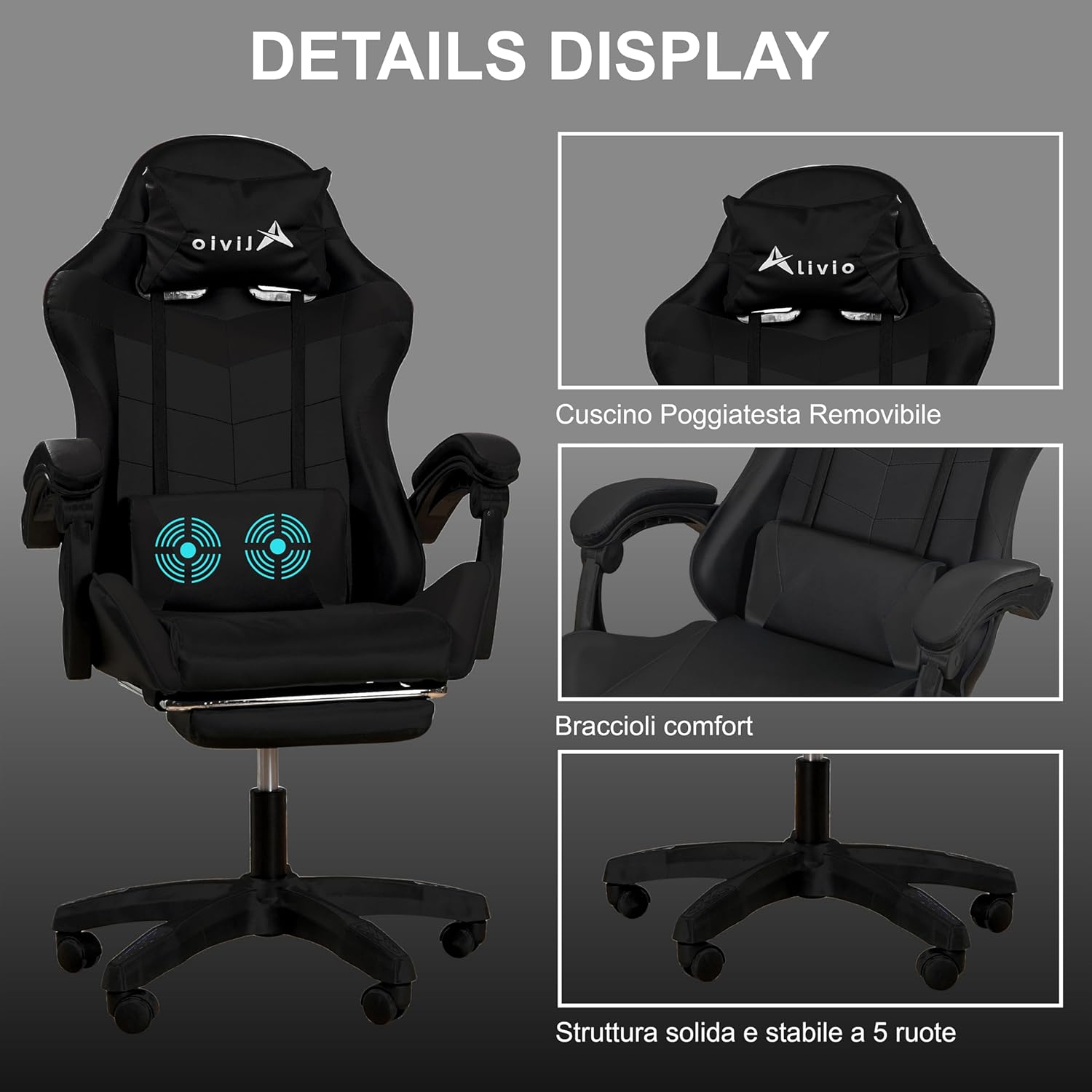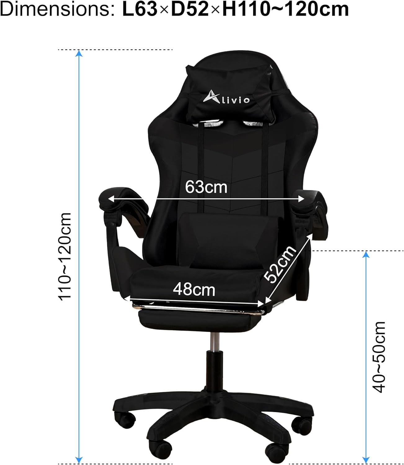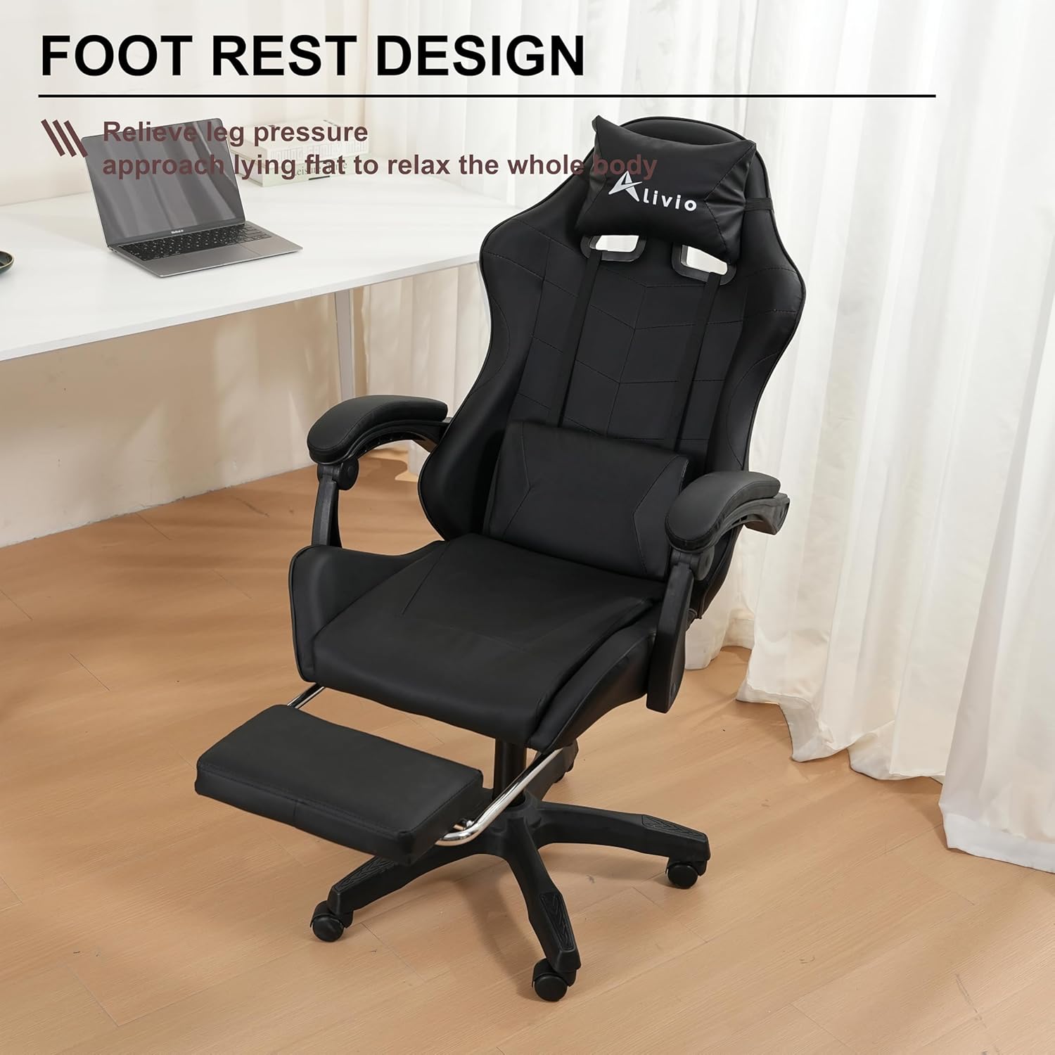 The Alivio professional gaming chair is built for serious gamers and smart-working executives who crave the adrenaline of a fully equipped gaming seat, featuring an all-metal frame, 160-degree full-tilt mechanism, retractable footrest, height-adjustable seat, and linked armrests, along with a complimentary neck pillow and USB-powered lumbar massage pillow for optimal comfort. Its thickened memory-foam padding on the seat and armrests, combined with supportive headrest and lumbar cushions, ensures exceptional comfort during long sessions. Crafted with high-density shaping foam for enhanced resilience, a sturdy 1.8mm steel frame for stability, and skin-friendly, wear-resistant PU leather, the Alivio Racing gaming chair is perfect for home, office, conference spaces, or gaming rooms and makes an ideal gift for any occasion.