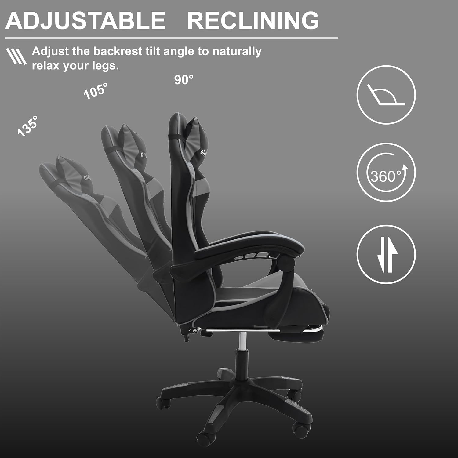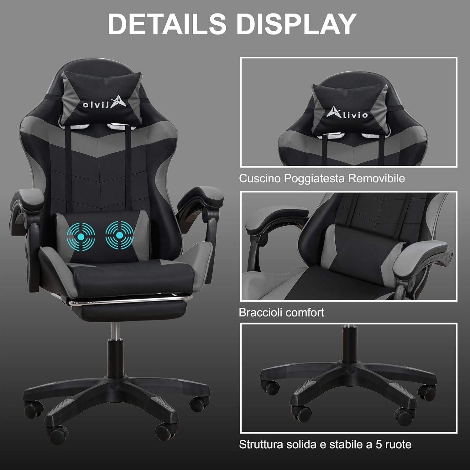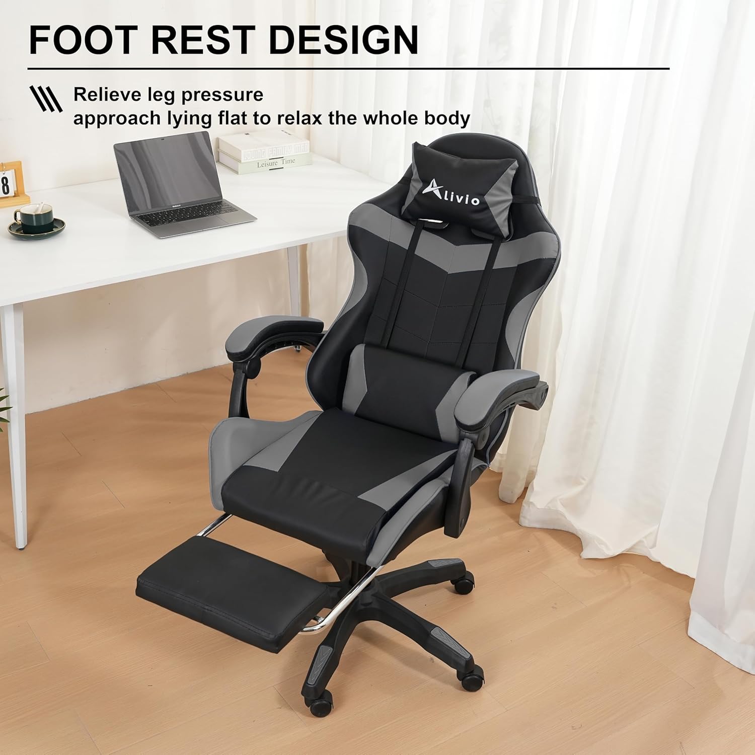 The Alivio professional gaming chair is built for serious gamers and smart-working executives who crave the adrenaline of a fully equipped gaming seat, featuring an all-metal frame, 160-degree full-tilt mechanism, retractable footrest, height-adjustable seat, and linked armrests, along with a complimentary neck pillow and USB-powered lumbar massage pillow for optimal comfort. Its thickened memory-foam padding on the seat and armrests, combined with supportive headrest and lumbar cushions, ensures exceptional comfort during long sessions. Crafted with high-density shaping foam for enhanced resilience, a sturdy 1.8mm steel frame for stability, and skin-friendly, wear-resistant PU leather, the Alivio Racing gaming chair is perfect for home, office, conference spaces, or gaming rooms and makes an ideal gift for any occasion.