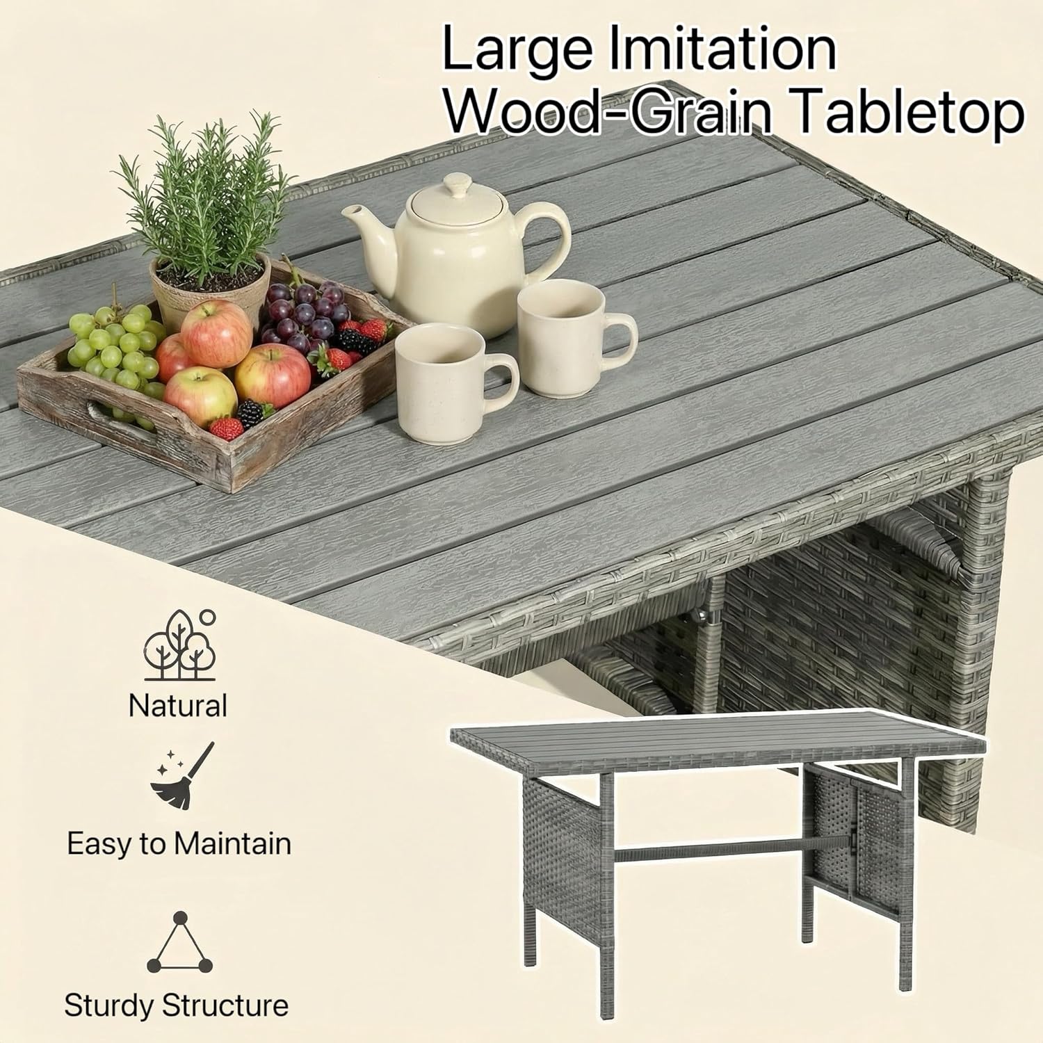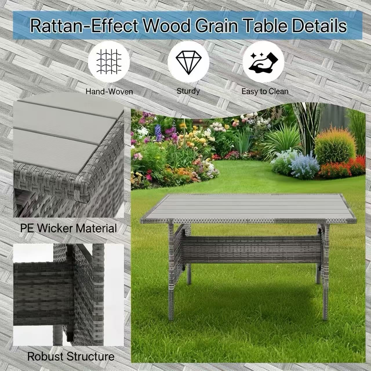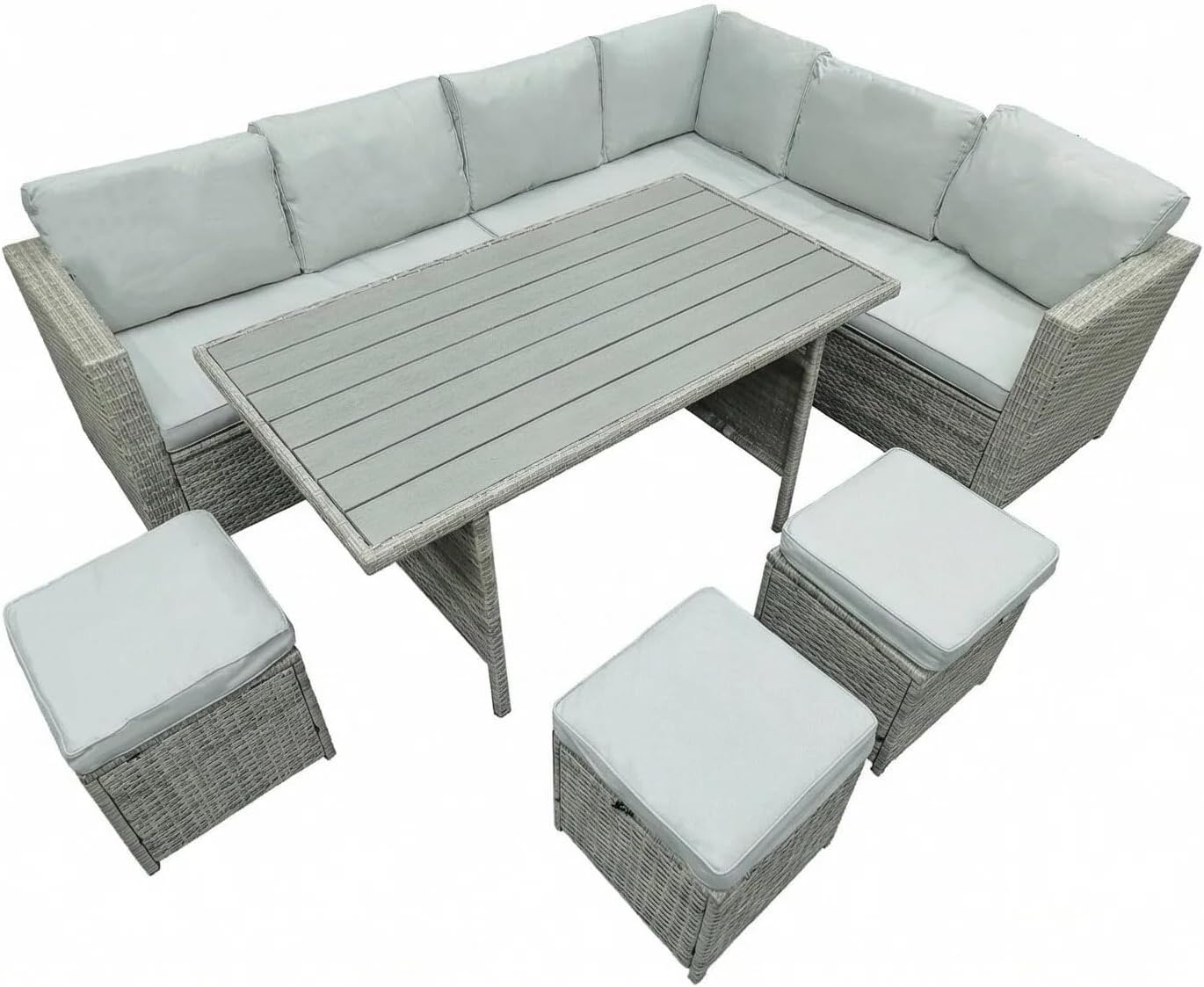Enhance your outdoor space with this 9-Seater Rattan Garden Sofa Set, designed for comfort, style, and functionality. Made with weather-resistant PE rattan and a strong steel frame, it offers durability for gardens, patios, balconies, decks, or backyards. The spacious L-shaped sectional sofa with soft grey cushions, matching dining table, and four cushioned stools provide ample seating for relaxing, dining, or entertaining guests. With its modern woven design, thick comfortable cushions, and removable covers for easy cleaning, this elegant patio set creates the perfect setting for outdoor gatherings, meals, or casual relaxation.