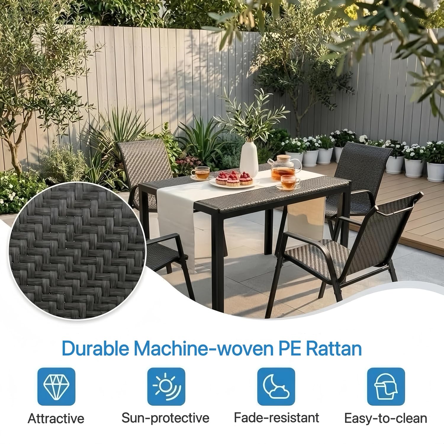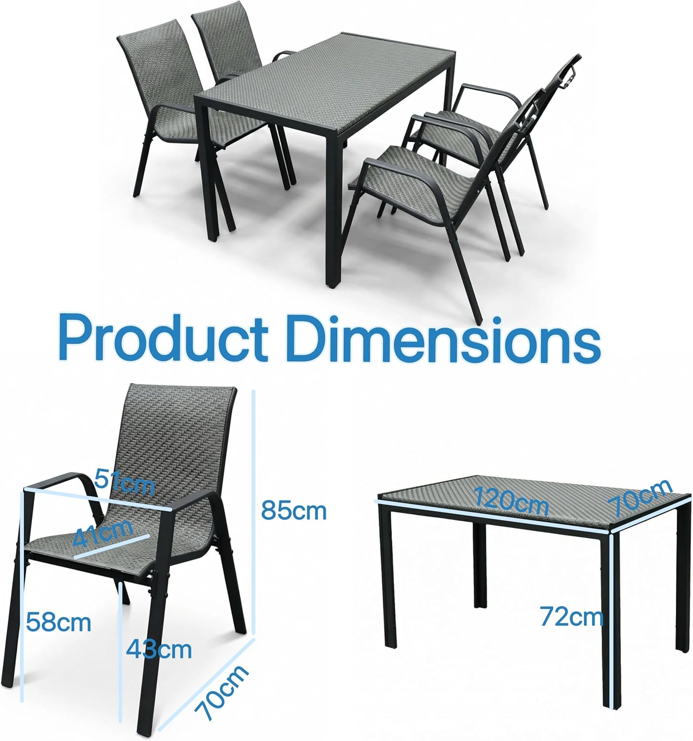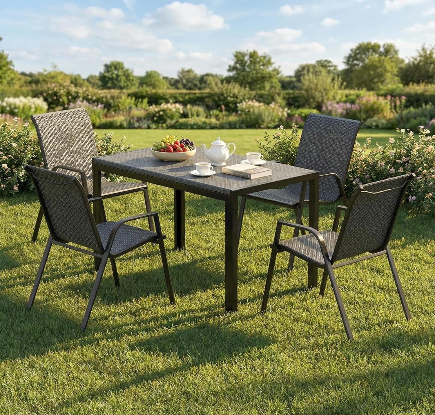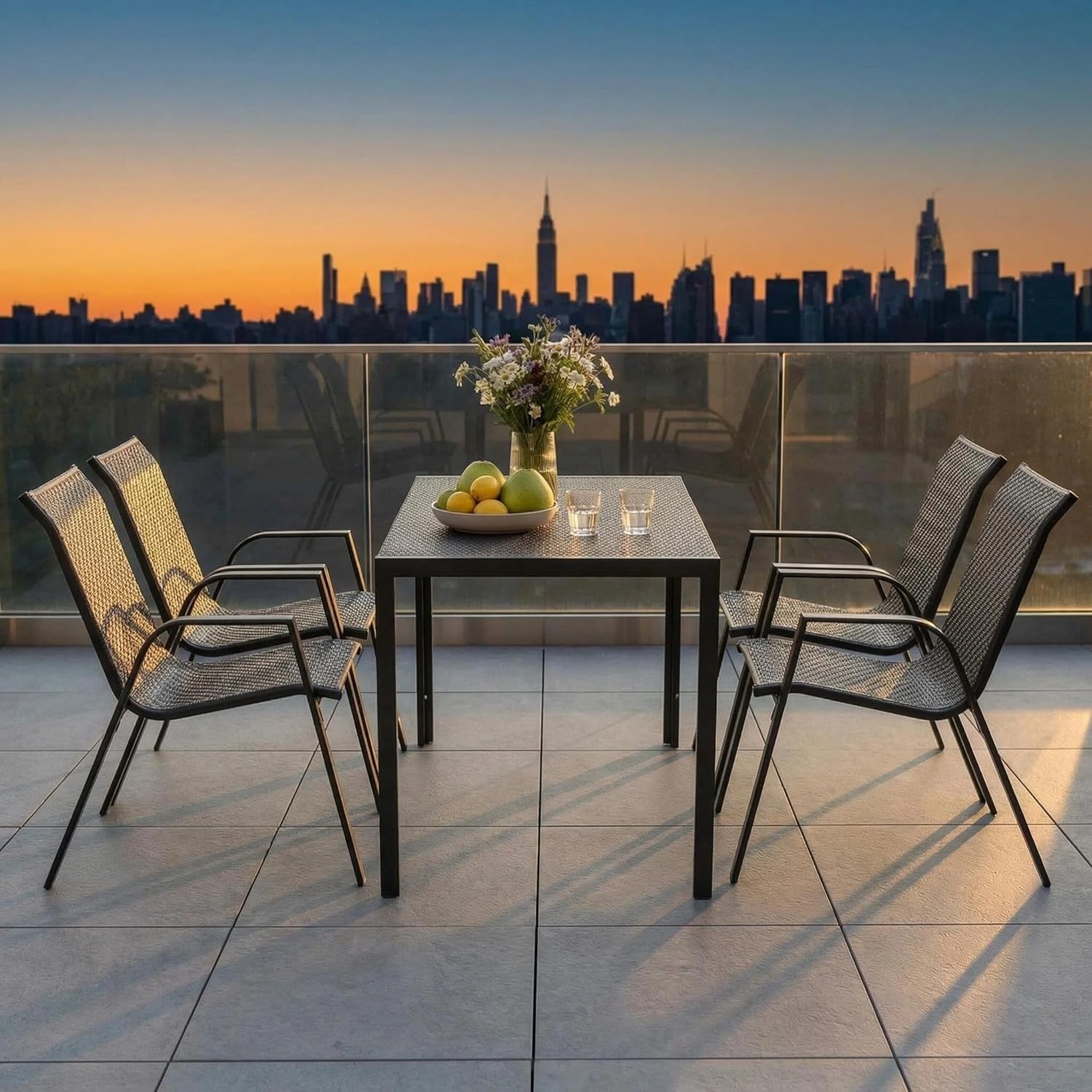 Upgrade your outdoor space with this modern patio dining table set with 4 chairs, designed for comfort, durability, and style. Perfect for gardens, balconies, patios, terraces, or backyards, the set features a sleek rectangular table and four ergonomic chairs with breathable mesh seats and backrests for added comfort in warm weather. Made from high-quality powder-coated metal, it is built to withstand sunlight, humidity, and light rain while maintaining its elegant look. Its minimalist modern design blends easily with any outdoor décor, making it ideal for outdoor meals, coffee time, or relaxing gatherings with family and friends.