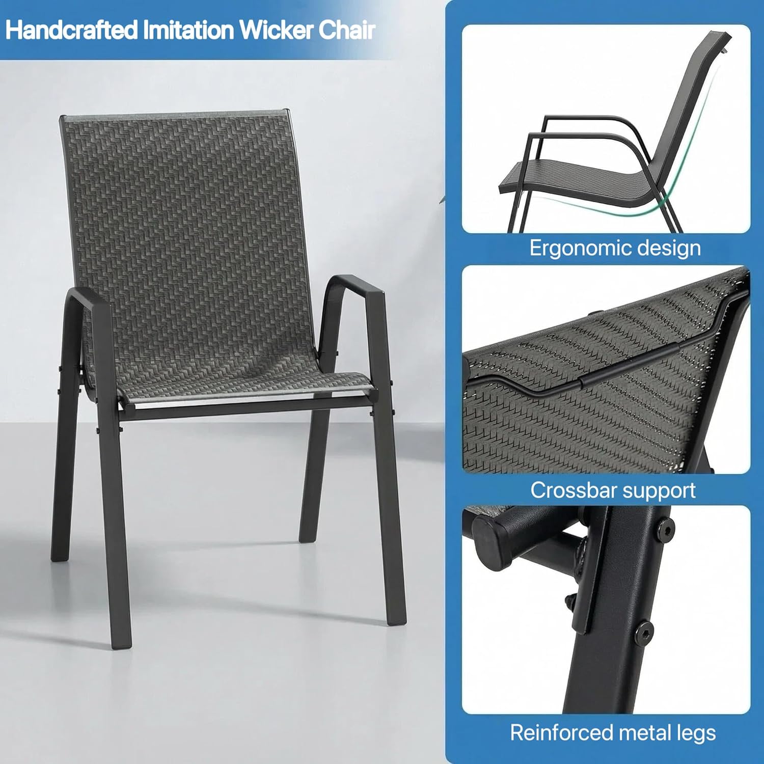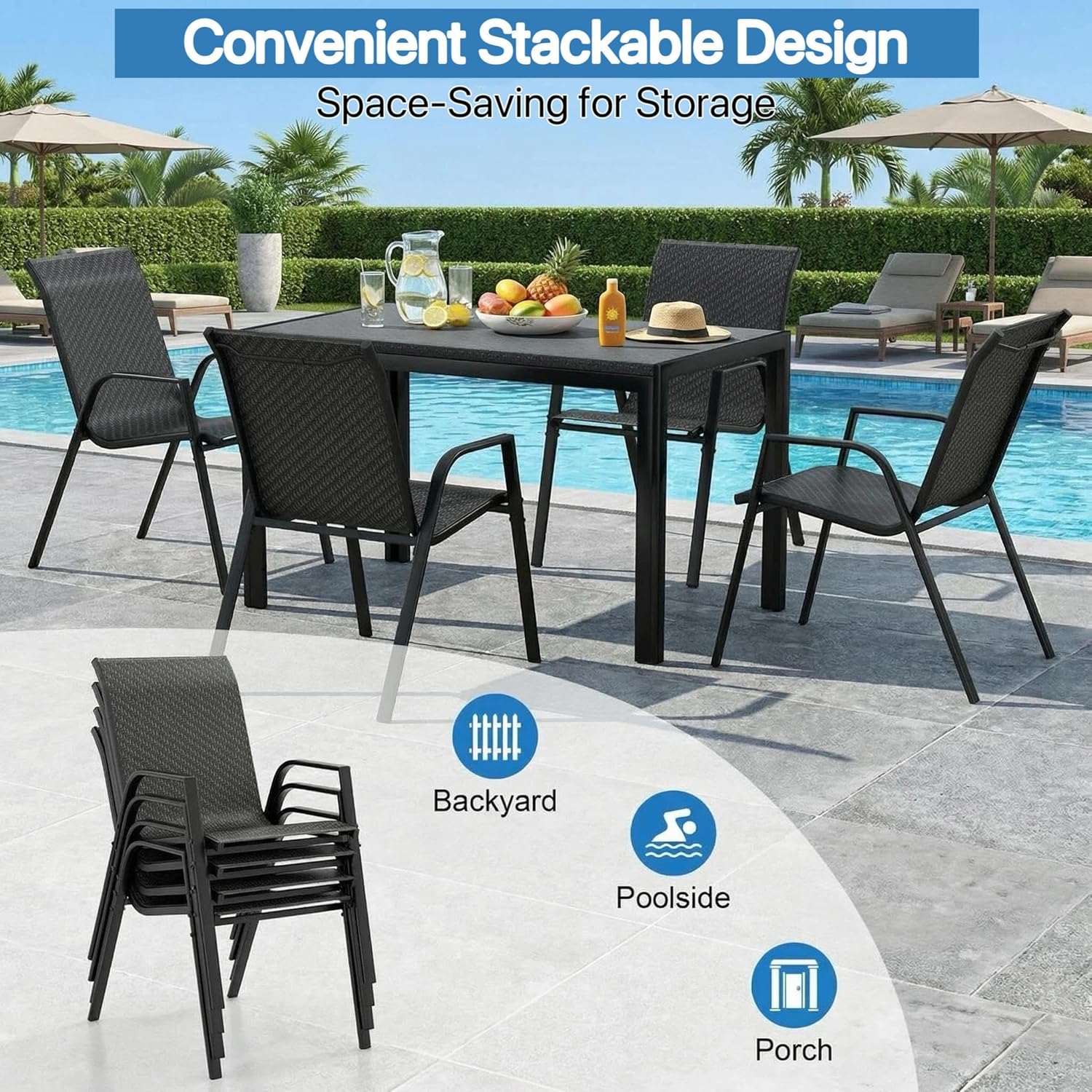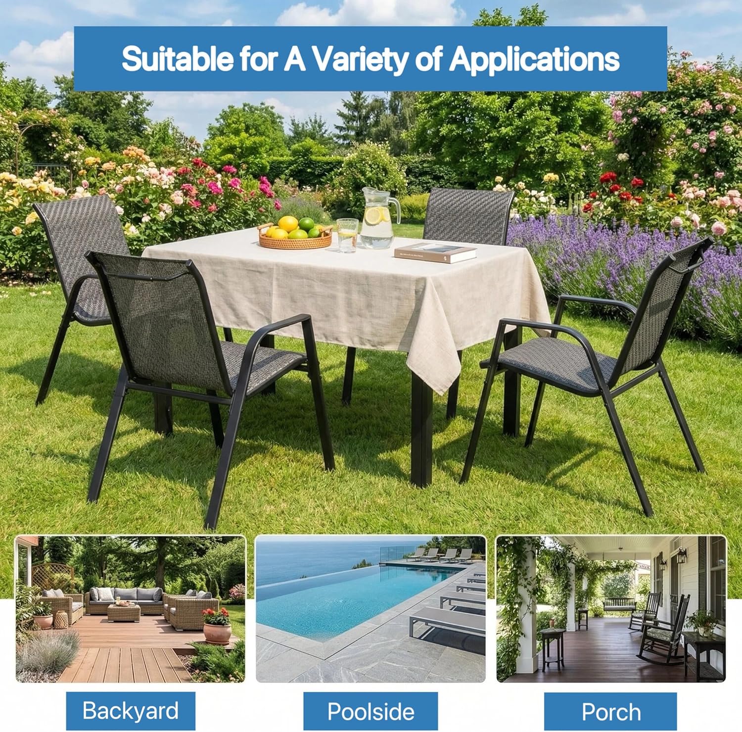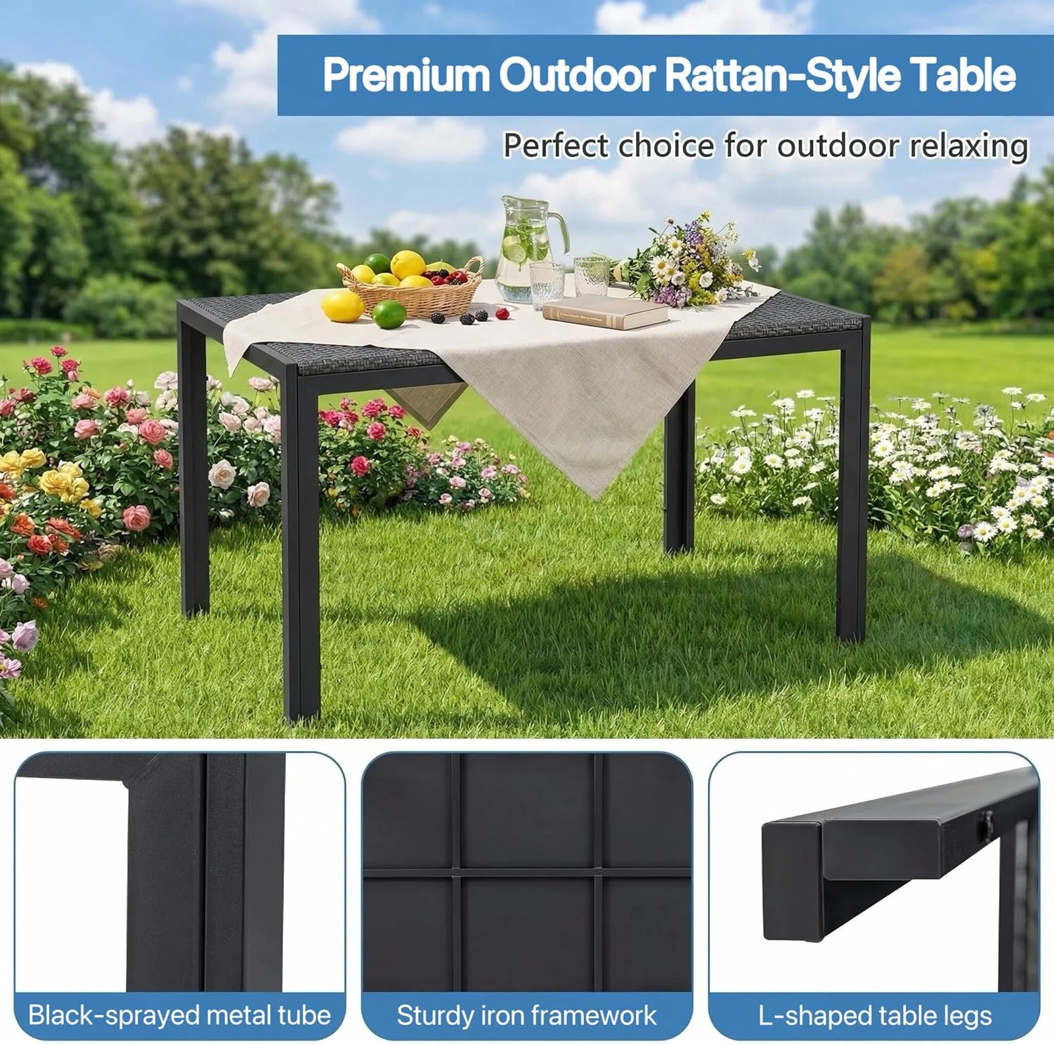 Upgrade your outdoor space with this modern patio dining table set with 4 chairs, designed for comfort, durability, and style. Perfect for gardens, balconies, patios, terraces, or backyards, the set features a sleek rectangular table and four ergonomic chairs with breathable mesh seats and backrests for added comfort in warm weather. Made from high-quality powder-coated metal, it is built to withstand sunlight, humidity, and light rain while maintaining its elegant look. Its minimalist modern design blends easily with any outdoor décor, making it ideal for outdoor meals, coffee time, or relaxing gatherings with family and friends.