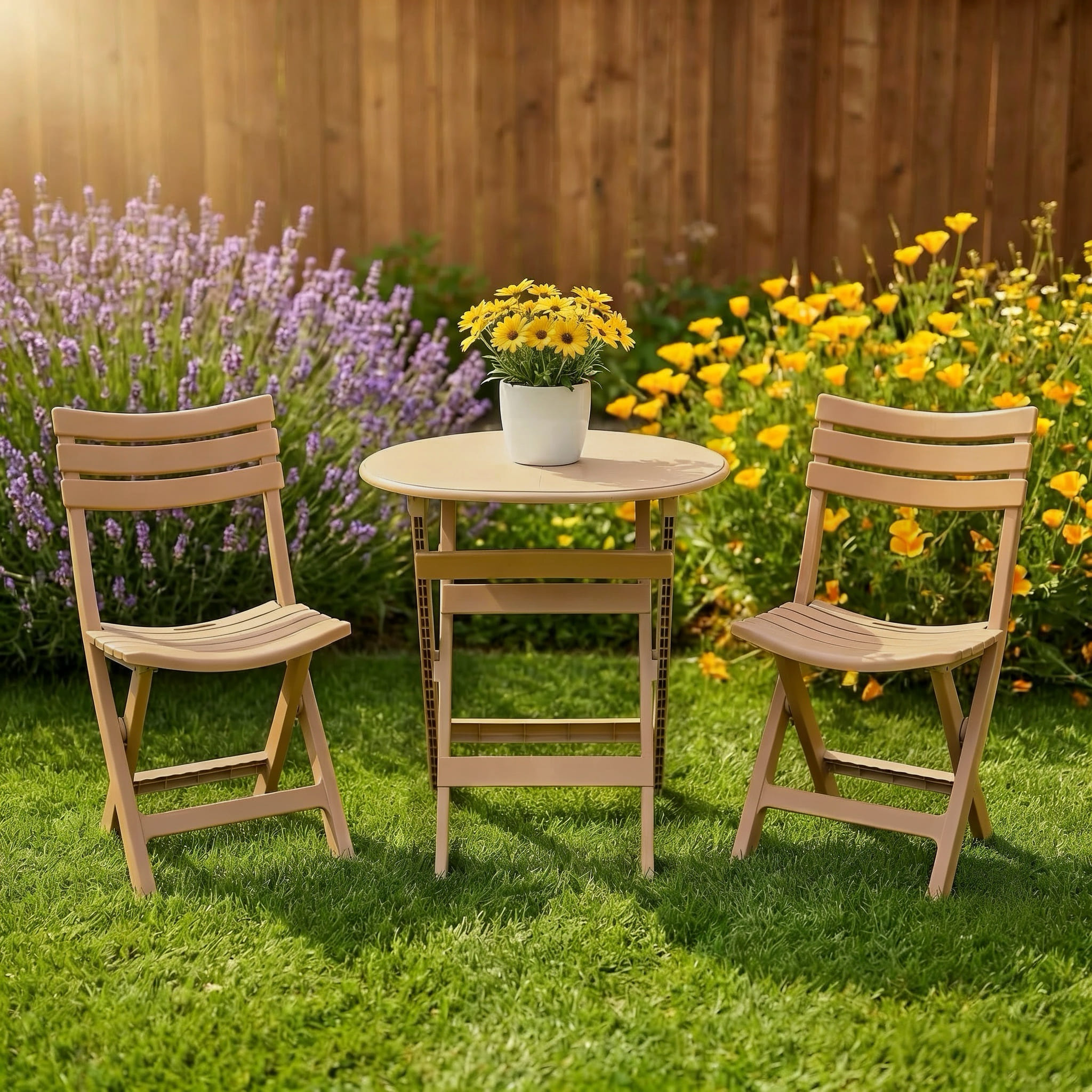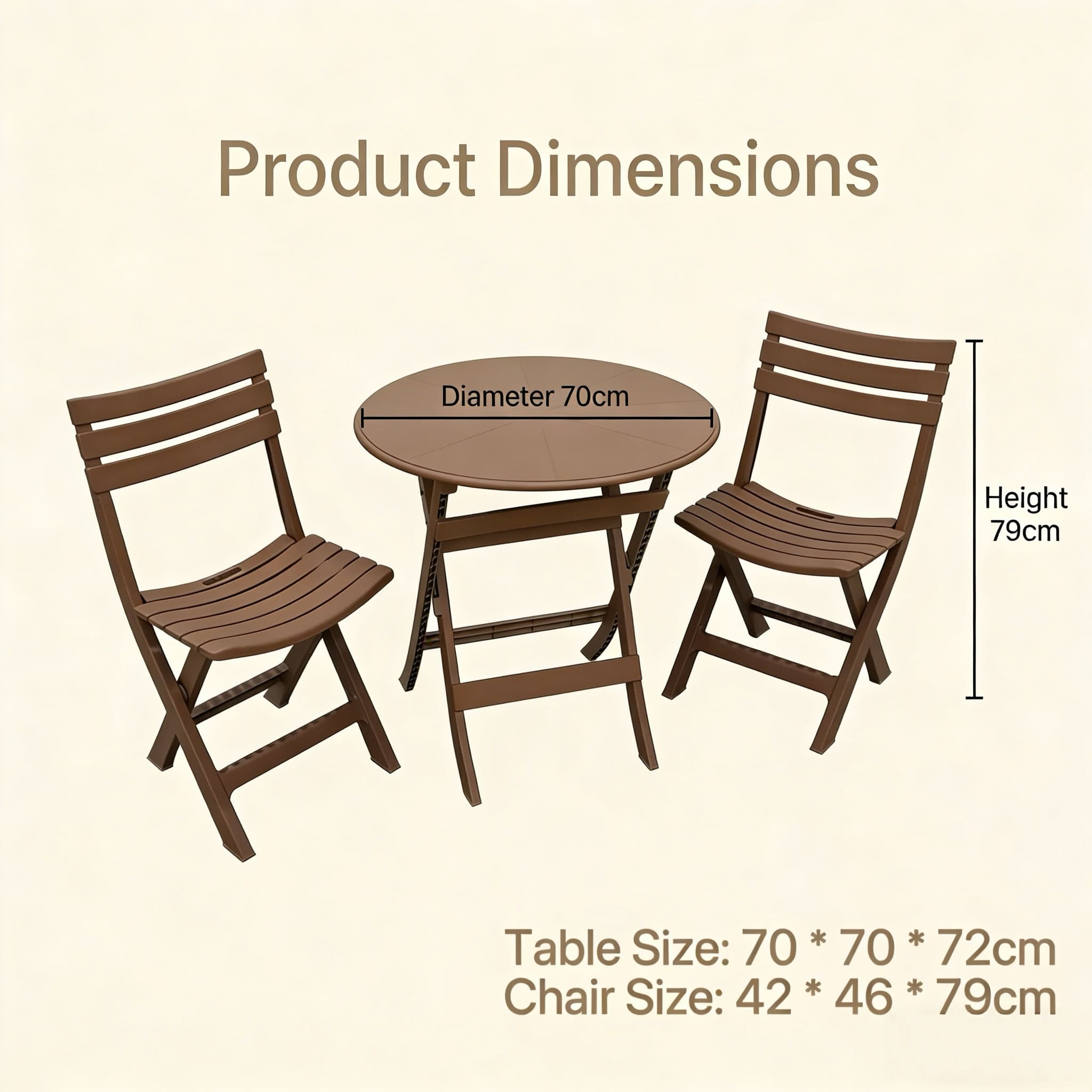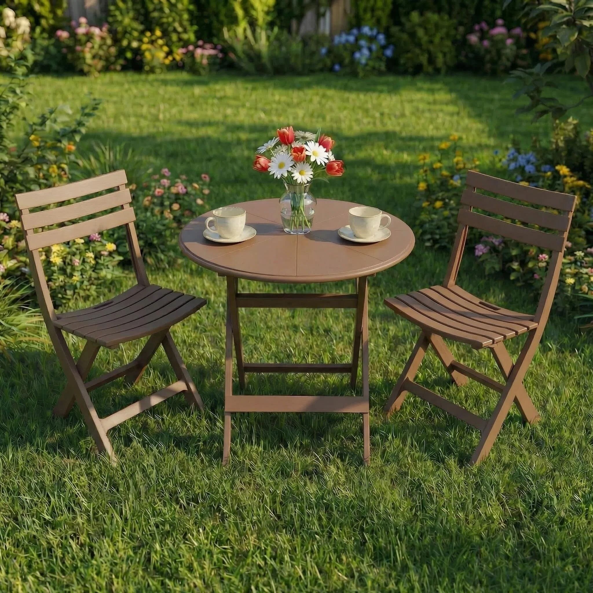 Upgrade your indoor or outdoor space with this stylish 3-piece folding bistro set featuring one round table and two matching chairs. Designed for balconies, patios, gardens, and cafes, it offers a perfect spot for coffee, meals, or relaxing. Made from durable yet lightweight materials, it ensures stability and effortless handling. The slatted design allows airflow and quick drying, making it ideal for outdoor use. Its foldable structure saves space and allows convenient storage while the smooth surface makes cleaning simple. A practical and modern seating solution for everyday use.