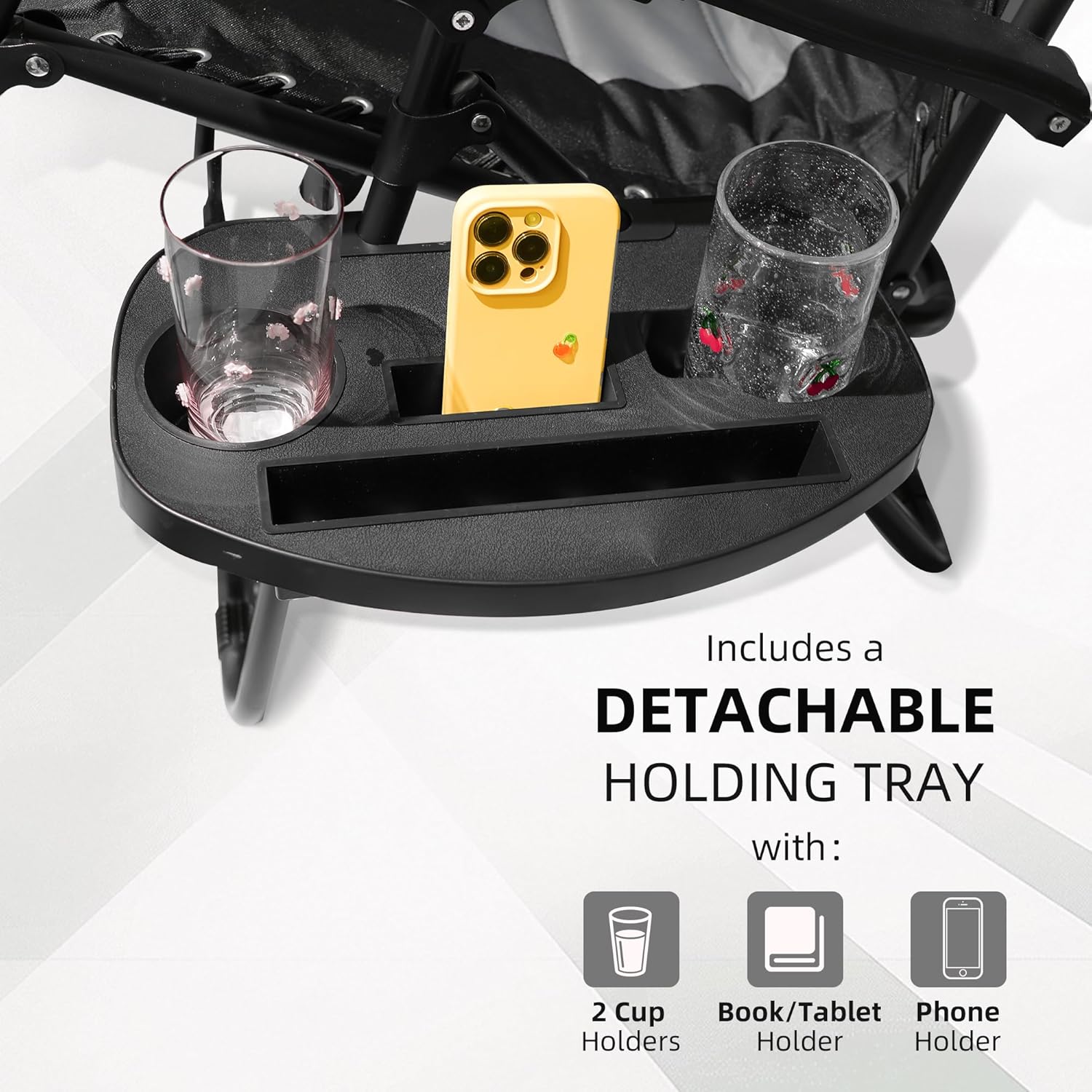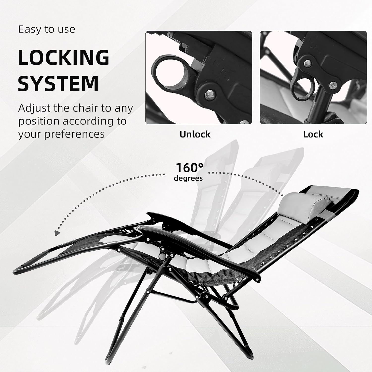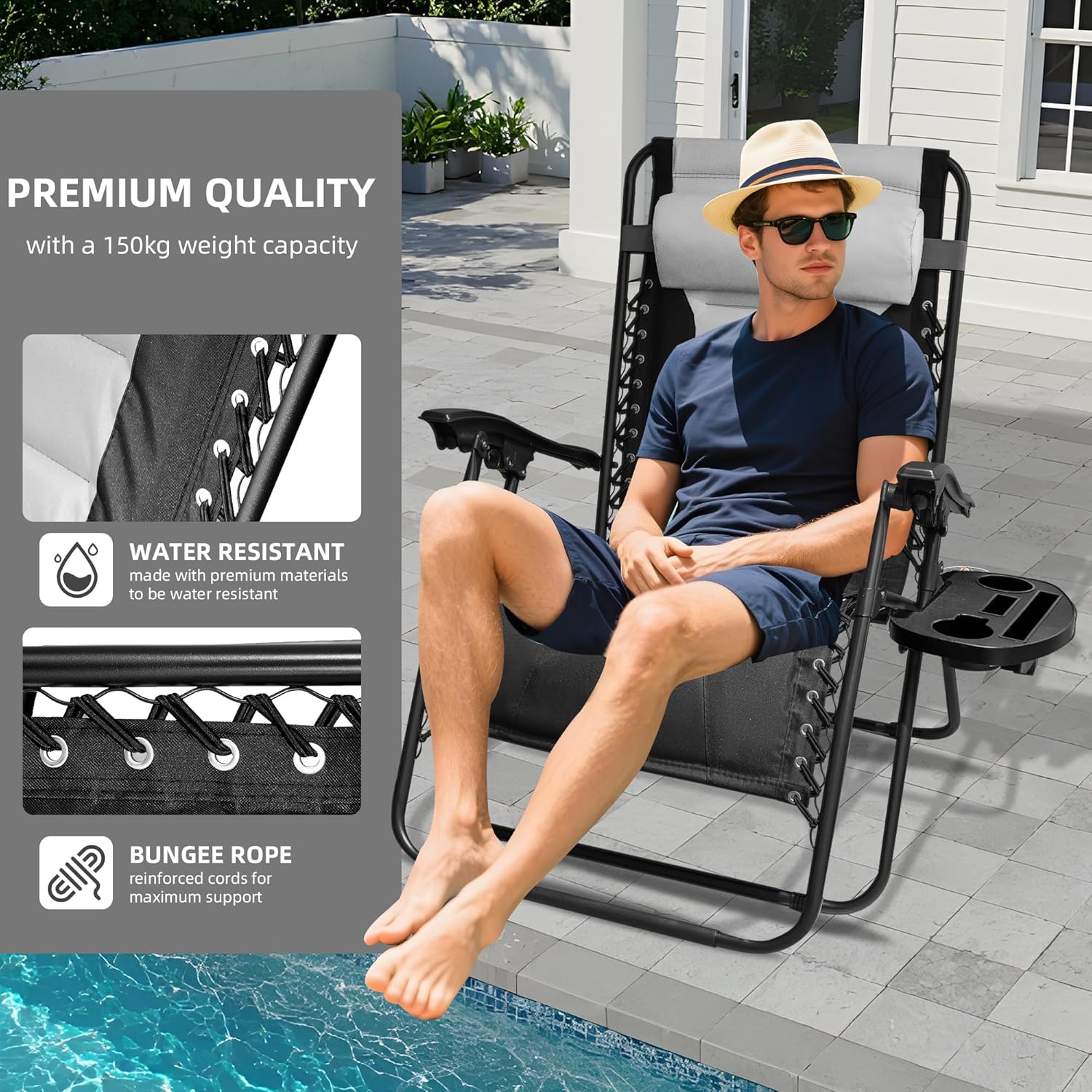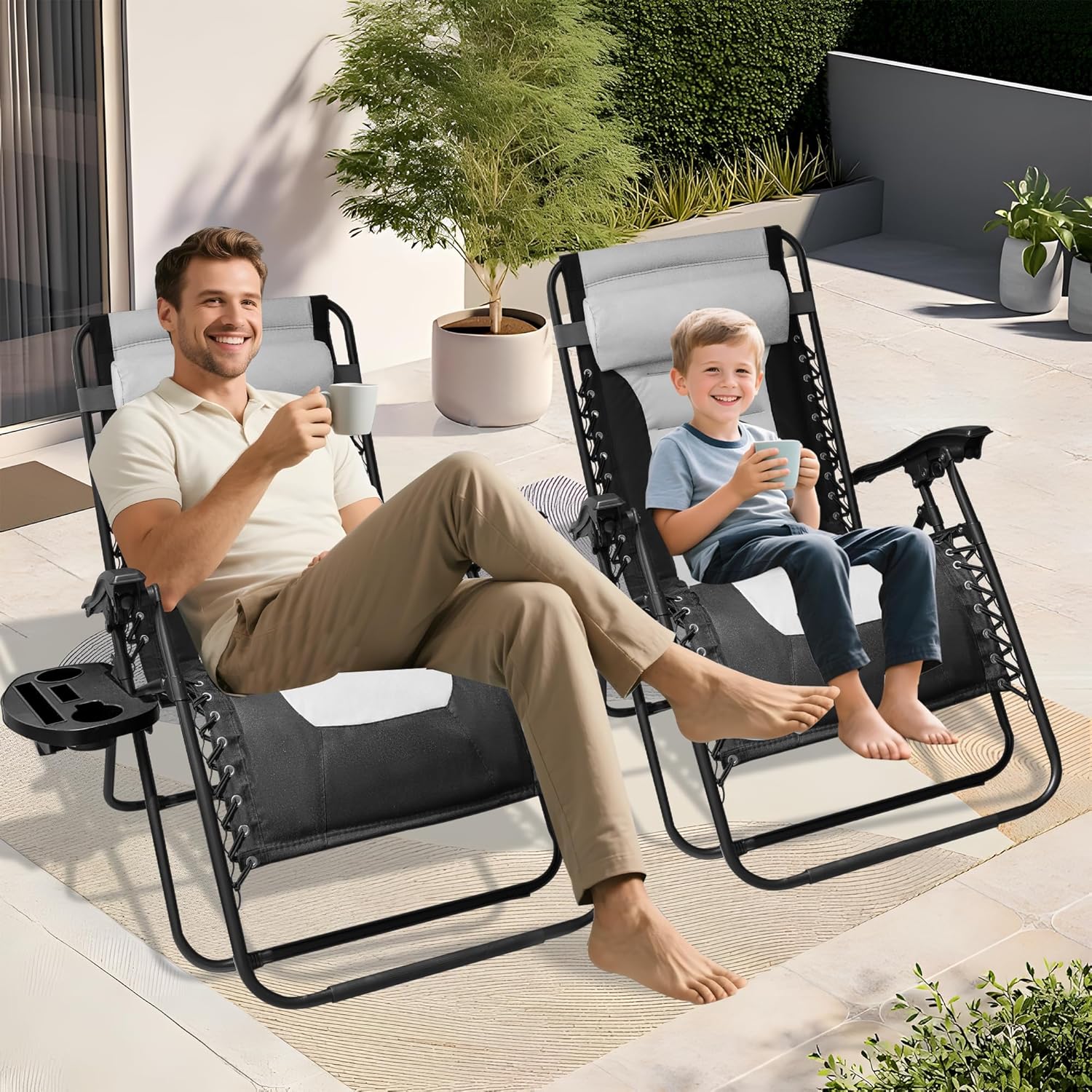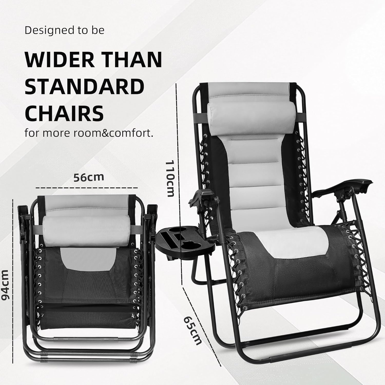 The Alivio Set of 2 Padded Gravity Chairs Sunloungers offers ultimate outdoor relaxation with a durable, heavy-duty frame supported by reinforced bungee cords and a lockable reclining system that allows for customizable comfort. Designed with extra-wide, padded seating for added space and support, each chair measures 56 x 65 x 110 cm and holds up to 150kg. Crafted from premium, water-resistant materials, these loungers are ideal for garden or patio use in various weather conditions. The set includes a detachable holding tray featuring two cup holders, a phone holder, and a book/tablet slot, providing convenient access to your essentials while you unwind.