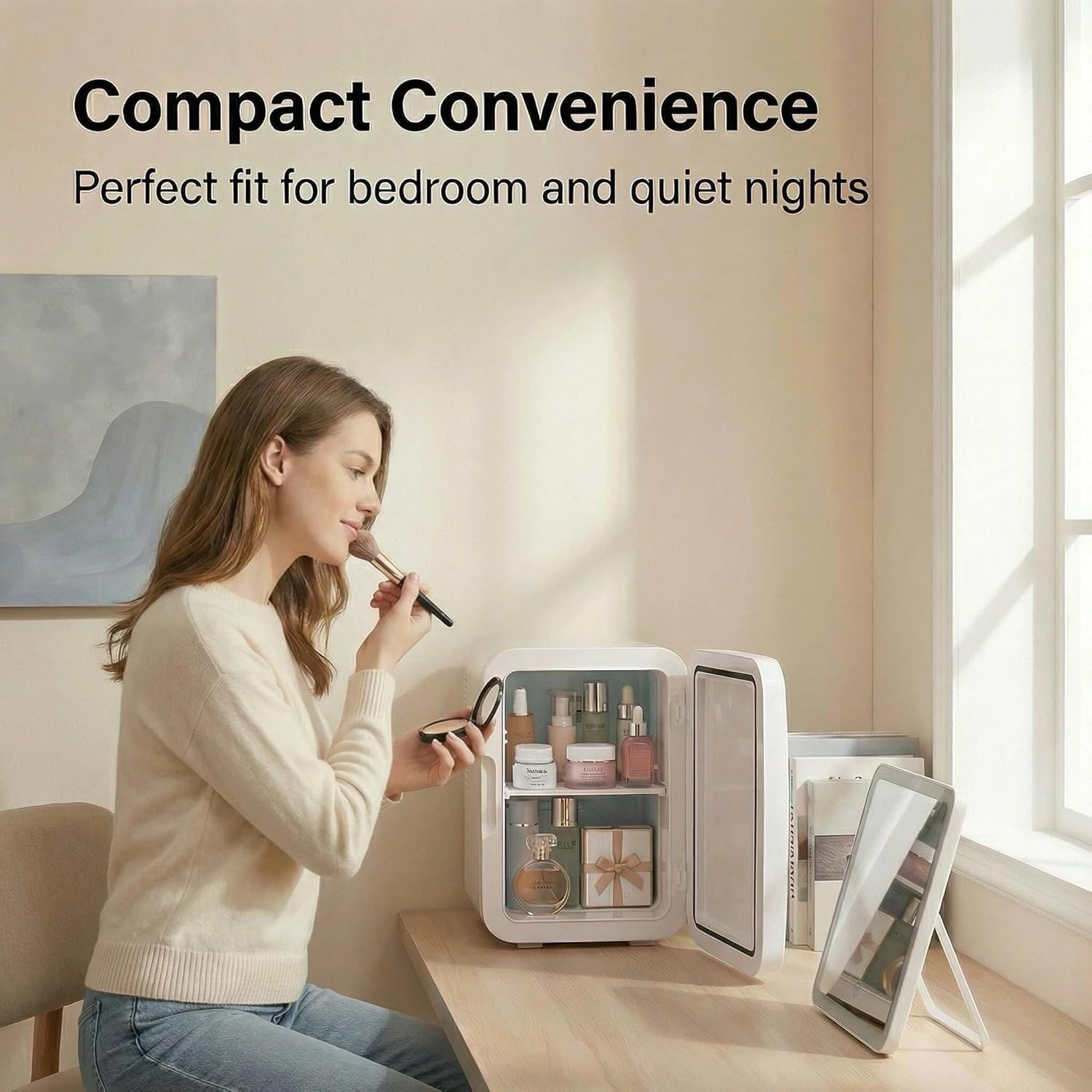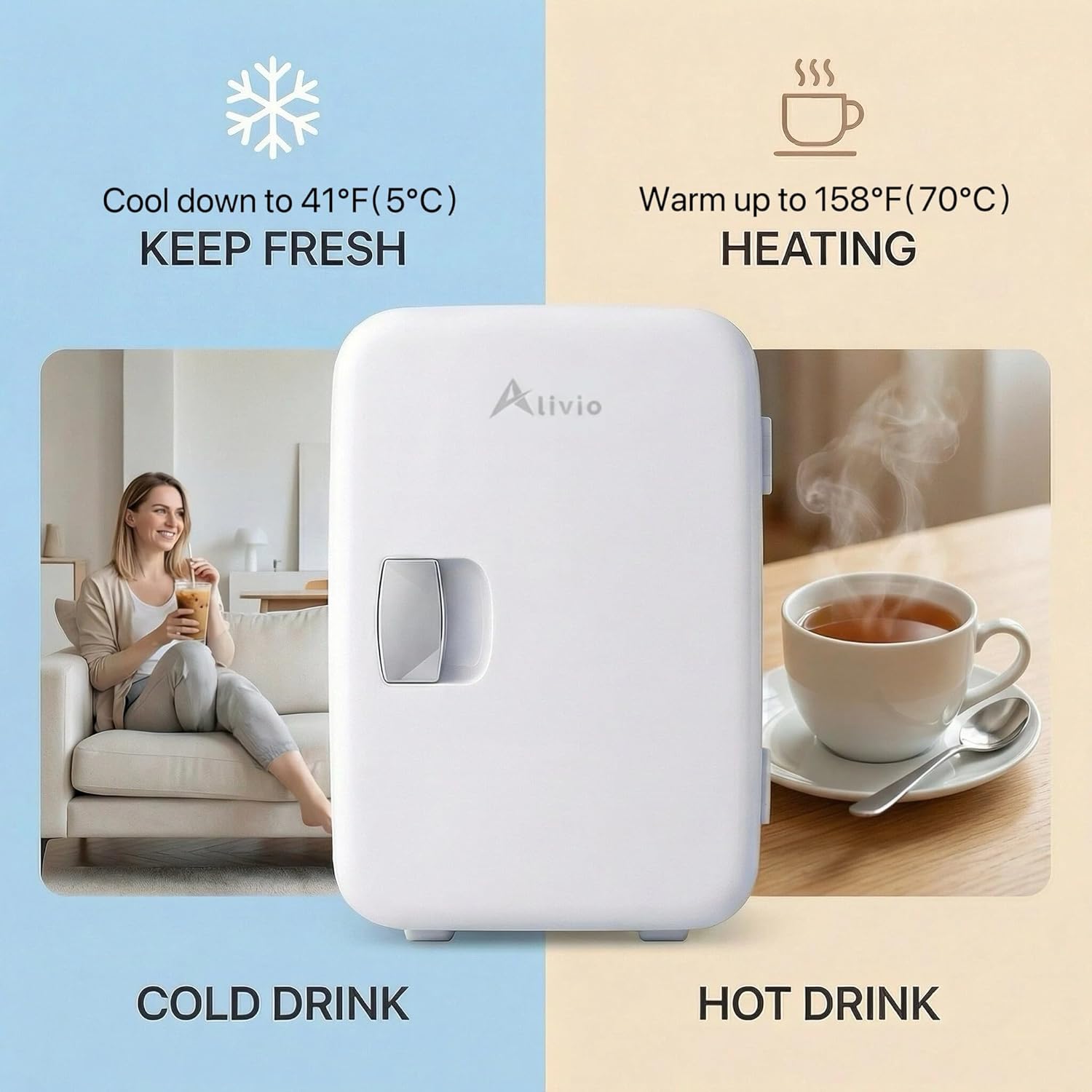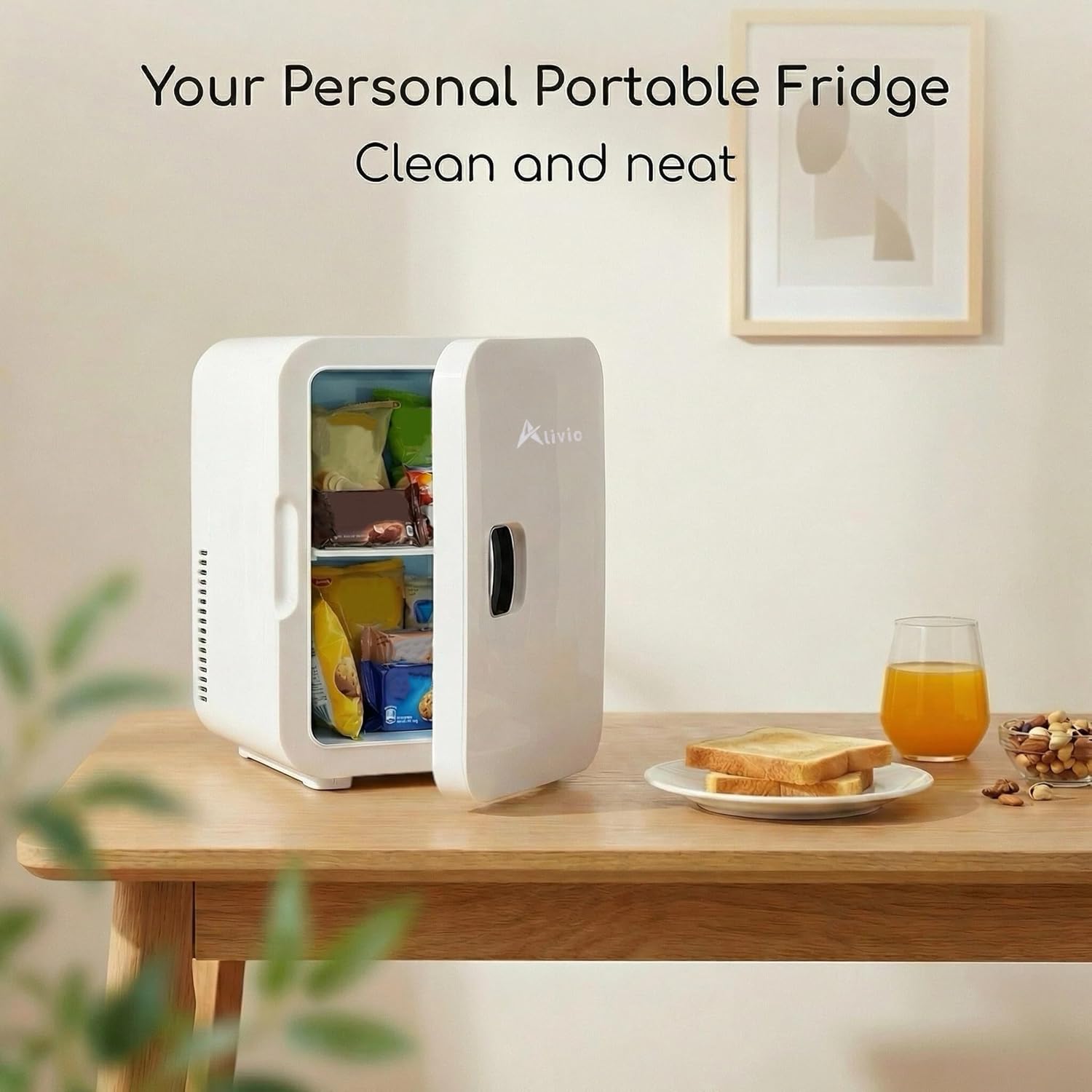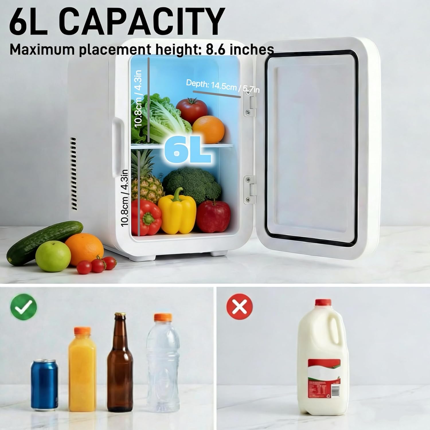 This 6L compact mini fridge is thoughtfully designed to deliver maximum storage in a space-saving form, making it perfect for personal use at home, in the office, or on the go. Despite its small size, it can comfortably hold up to 6 standard 330ml cans or a mix of snacks, beverages, skincare products, or medicines. Its lightweight build and convenient carry handle ensure easy portability, whether you're using it in your bedroom, dorm, or car or taking it along for road trips and camping. Equipped with efficient cooling technology, it maintains a consistent temperature to keep your items fresh and chilled, with its ultra-quiet operation without disturbance. The energy efficiency and design help reduce power consumption, making it suitable for long-term use. Additionally, the user-friendly door with a secure seal preserves internal cooling, and the smooth interior surface allows for quick and effortless cleaning, ensuring hygiene and convenience at all times.