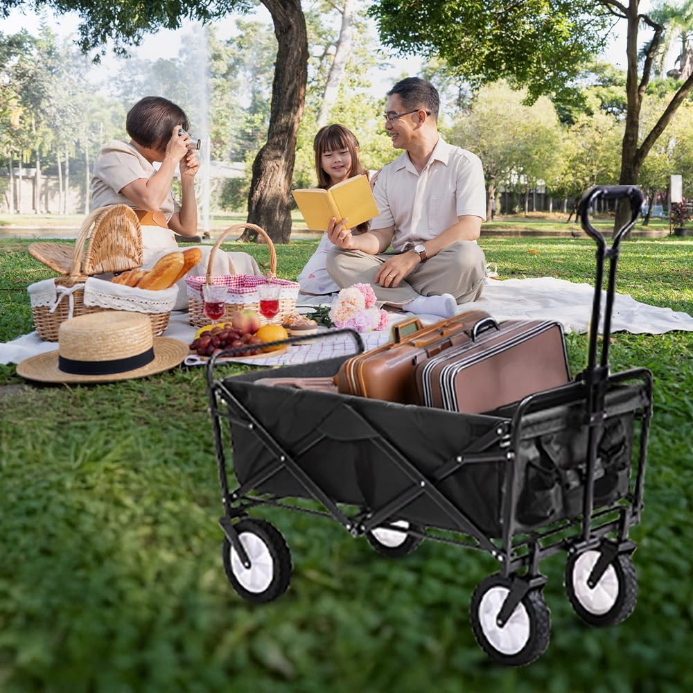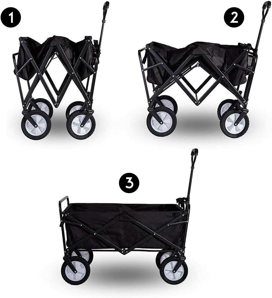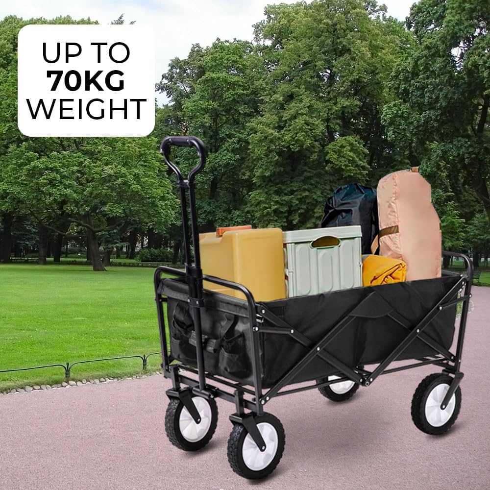 The heavy-duty foldable garden trolley cart wagon is a versatile and robust solution for all your transportation needs. With a large capacity, this wagon sets up in seconds without requiring any assembly. Its outside dimensions are approximately 90 x 50 x 100 cm, while the inside dimensions are approximately 80 x 44 x 25 cm. When folded, the wagon becomes incredibly compact, only 8 inches thick, making it easy to store with folded dimensions of approximately 75 x 50 x 20 cm. Built to handle loads up to 150 kg, the trolley features a durable Oxford cloth fabric that is easy to clean, ensuring it remains in excellent condition even with heavy use. Functional features of the wagon include an adjustable handle for effortless transport and two mesh cup holders to keep your beverages secure. The trolley is UV- and mildew-resistant, making it suitable for various weather conditions. It is perfect for hauling gear to outdoor sporting events, concerts, trips to the park or beach, and is equally useful around the house. Constructed from steel tube and nylon, the wagon includes a padded handle and four large solid rubber tires, enhancing its ease of use and durability. Available in black, blue, or red, this garden trolley cart is both practical and stylish.