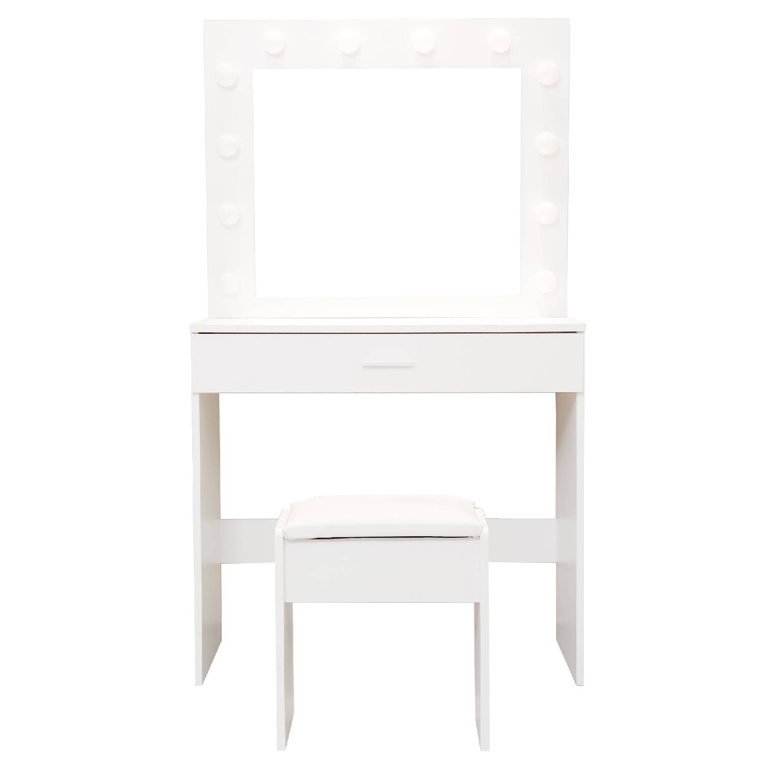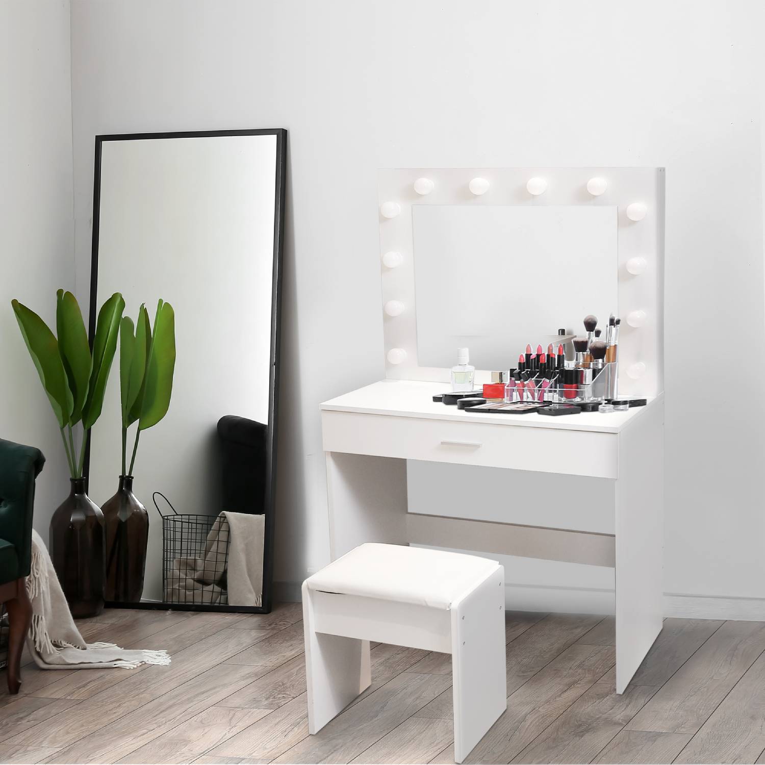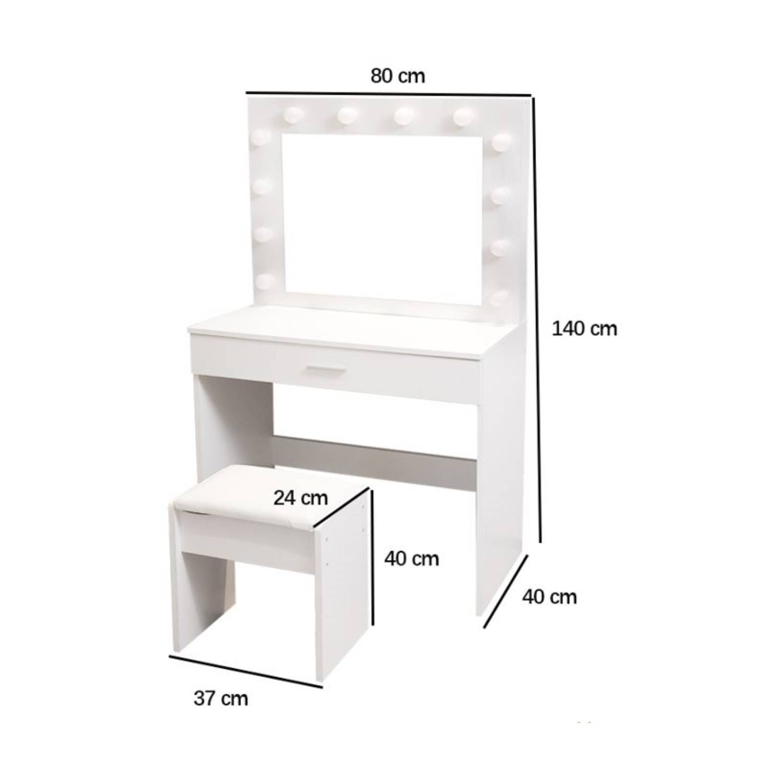 Elevate your daily beauty routine with our exquisite Dressing Table Makeup Table, a harmonious blend of functionality, style, and modern design. This versatile dressing table is meticulously crafted to become the focal point of your vanity area, offering both practical storage and a touch of elegance to your space. The centerpiece of this makeup table is the built-in LED mirror, designed to illuminate your beauty regimen. The LED mirror not only provides ample lighting but also boasts a protection class of IP20, ensuring safety and durability. With a power output of 10 watts and a voltage range of 100-240 V, it delivers the perfect balance of brightness and energy efficiency. Two spacious drawers offer ample storage for all your cosmetics, skincare, and accessories, helping you keep your beauty essentials neatly organized and within arm's reach. The chrome-plated steel frame of the designer stool is not only sturdy but also adds a touch of sophistication to your grooming space. The synthetic leather upholstery ensures comfort while you prepare for the day ahead.