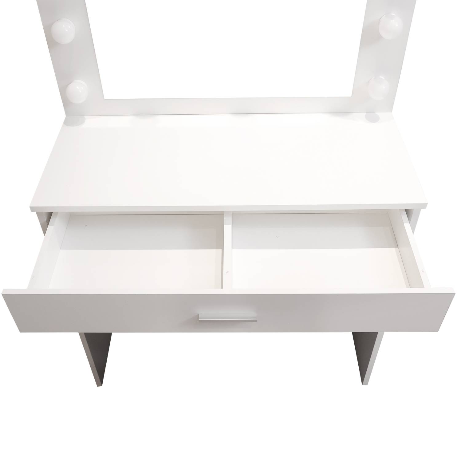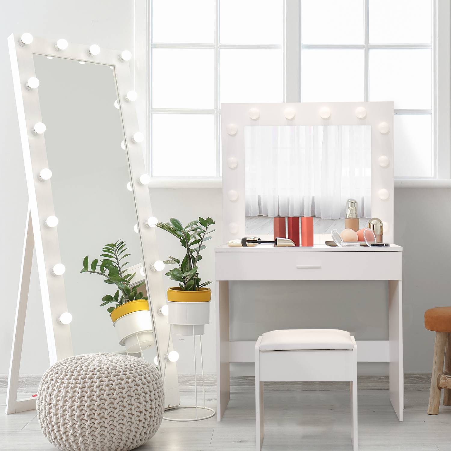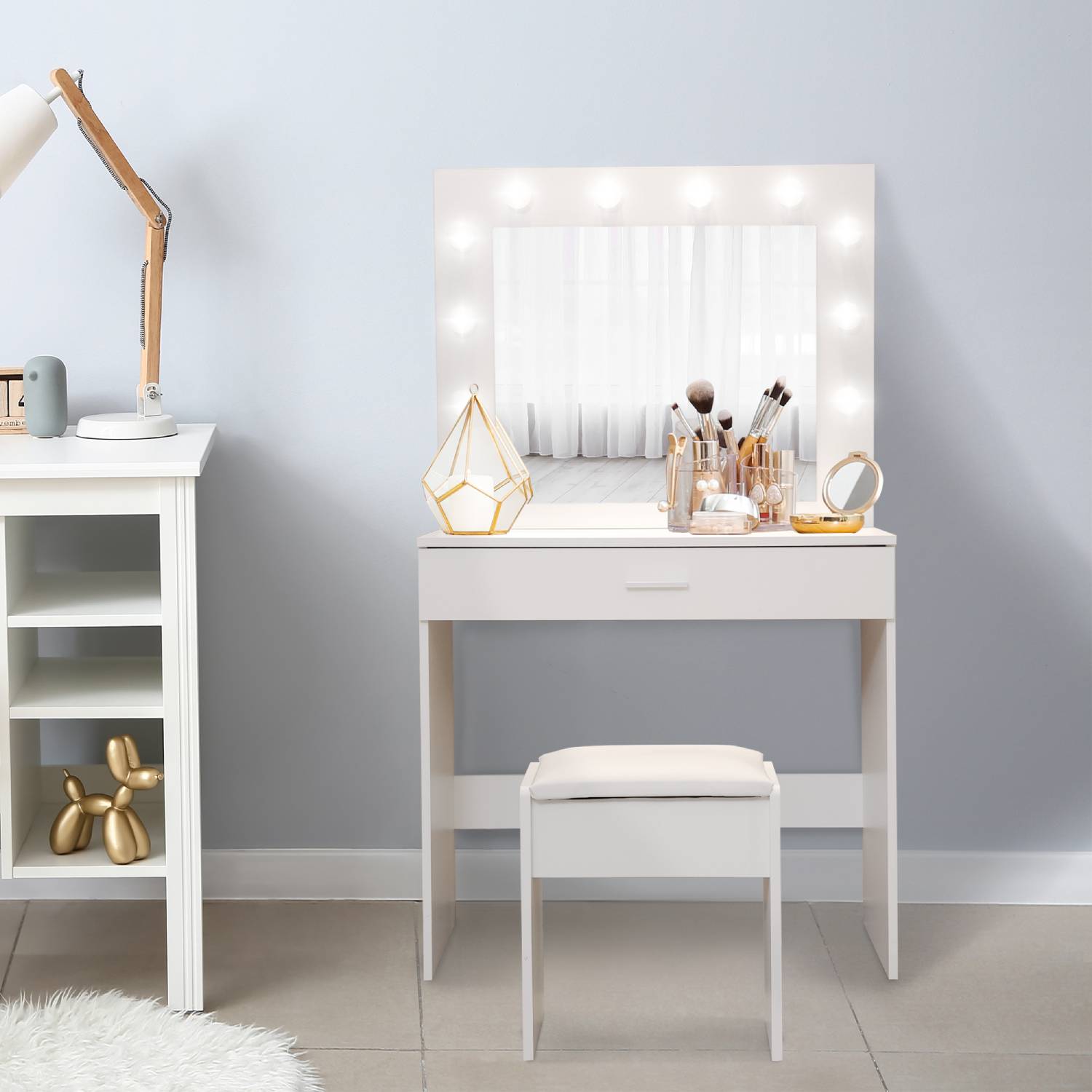 Elevate your daily beauty routine with our exquisite Dressing Table Makeup Table, a harmonious blend of functionality, style, and modern design. This versatile dressing table is meticulously crafted to become the focal point of your vanity area, offering both practical storage and a touch of elegance to your space. The centerpiece of this makeup table is the built-in LED mirror, designed to illuminate your beauty regimen. The LED mirror not only provides ample lighting but also boasts a protection class of IP20, ensuring safety and durability. With a power output of 10 watts and a voltage range of 100-240 V, it delivers the perfect balance of brightness and energy efficiency. Two spacious drawers offer ample storage for all your cosmetics, skincare, and accessories, helping you keep your beauty essentials neatly organized and within arm's reach. The chrome-plated steel frame of the designer stool is not only sturdy but also adds a touch of sophistication to your grooming space. The synthetic leather upholstery ensures comfort while you prepare for the day ahead.